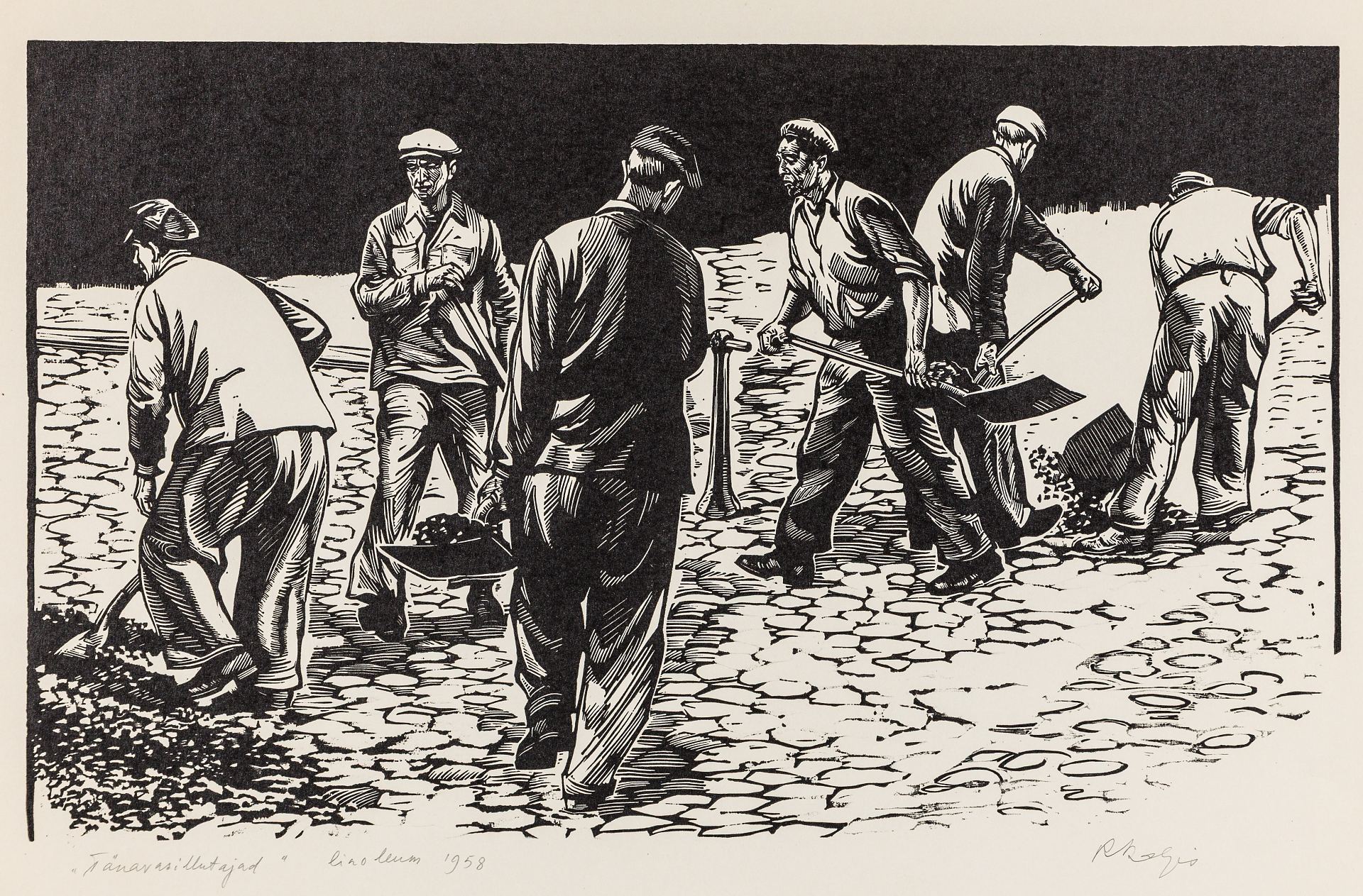 Richard Kaljo (1914 - 1978) 11 Tänavasillutajad 1958 Kunstiteadlane Boris Bernstein on iseloomustanud Kaljot olustiku¾anri viljelejena, keda köitis inimese kujutamine erinevates argistes tegevustes. “Tuleb püüelda suurema üldistuse, täisväärtuslikuma kunstnikukõne poole, mida ma oma vaimusilmas näen tihedana nagu aforismi, millelt ei saa sõnagi ära võtta ega juurde panna. [...] Oma suurimaks veaks pean seda, et kipun detailidesse laskuma. Pole veel leidnud küllalt suurt üldistust ja lihtsust,” on kunstnik arvamust avaldanud. Teos on reprodutseeritud KUMU kunstimuuseumis näitust “Richard Kaljo. Lood graafikas ja kirjades” saatnud raamatus lk 106. Käesolev teos on esindatud KUMU graafikakogus ning esinenud 2014. aastal KUMU näitusel "Richard Kaljo. Lood graafikas ja kirjades".