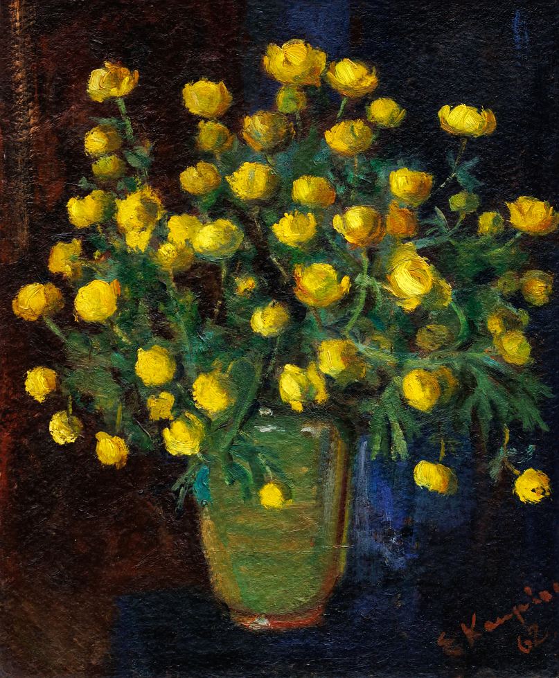 Elsa Kauping (1905–1972) 16 Kullerkupud 1962 Elsa Kauping oli pallaslane, kelle elukäik on jäänud suures osas teadmata. Kõige rohkem on ta tuntud vast Johannes Võerahansu modellina, olles tutvunud Pallases õpingukaaslastena. Hiljem said kahest kunstnikust elukaaslased, kuid elu viis nende teed siiski lahku. Elsa Kaupingi kohta on kahjuks säilinud väga vähesel määral informatsiooni. Kauping õppis Pallases alates 1928. aasta kevadest kuni 1936. aastani Triigi maaliateljees. Kaupingu enda maalipraktika paistab silma kammerlike motiivide ja traditsioonilise kompositsioonitunnetusega, peegeldades oma loomingus pallaslikku joonistuslikku distsipliini ja tasakaalustatud koloriiti.