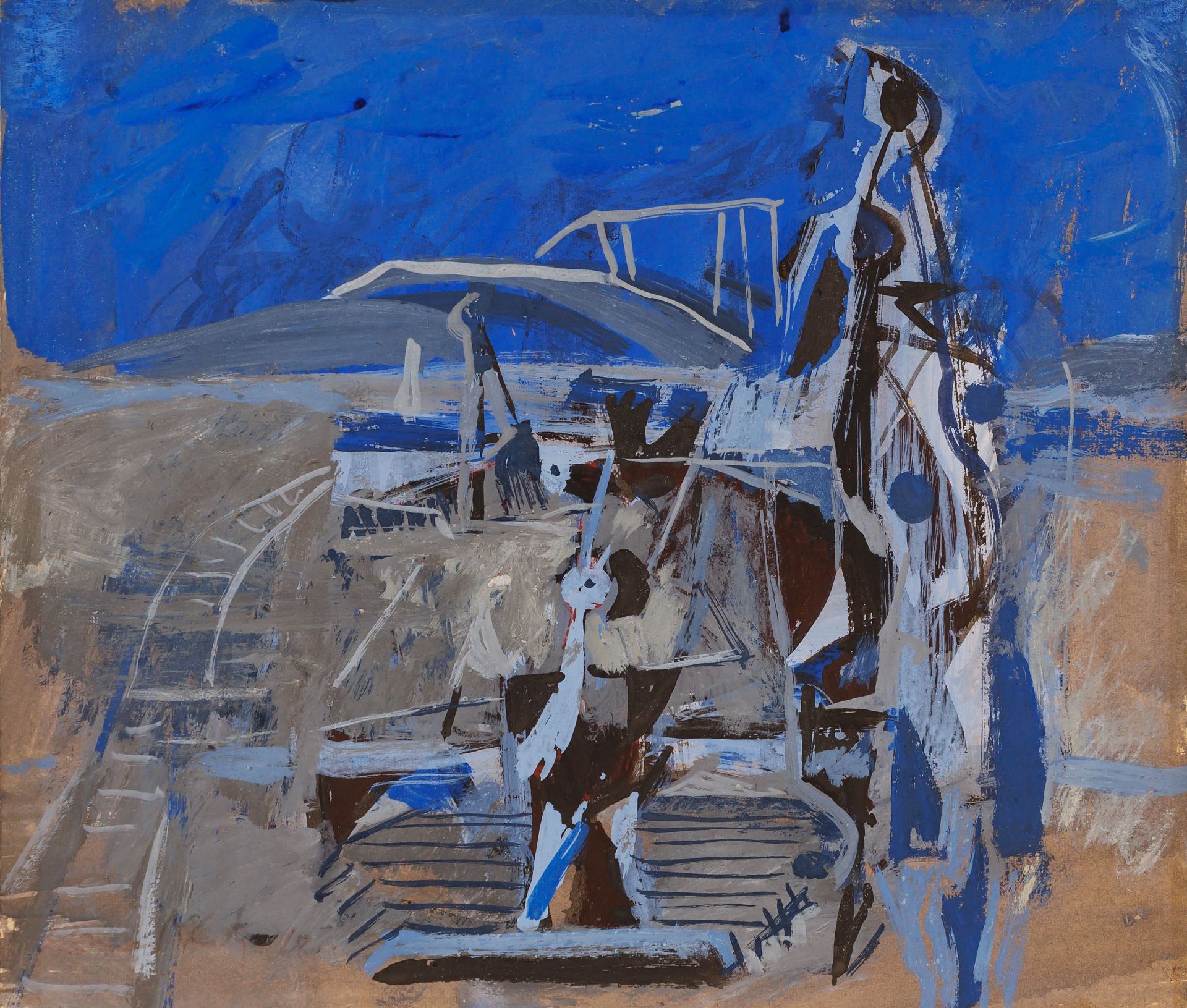 Elmar Kits (1913–1972) 19 Abstraktne 1957? Gua¹¹, paber 1950. aastate keskpaigas avardusid Elmar Kitse loomingulised võimalused tänu Hru¹t¹ovi sulaajale ning ta katsetas gua¹¹i ja akvarelliga, luues stiliseeritud linnavaateid ja poolabstraktseid kompositsioone. Kollektsionäär Enn Kunila on kirjutanud selle perioodi kohta: “Alles kümmekond aastat varem oleks abstraktne teos olnud mõeldamatu, sest ametlik kaanon nägi ette ranget realismi. Kuna Elmar Kits suutis meisterlikult töötada mitmes laadis ja ta oli oma ideoloogiliselt sobilike töödega leidnud laialdast tähelepanu, siis oli Kitsel märgatav renomee. Huvitaval kombel otsustas Kits kasutada aga ametlikku tunnustust kaitsekilbina, mille varjus hakata hoopis eksperimenteerima. See võimaldas aga abstraktsemal või üldse katsetuslikumal lähenemisel ka laiemalt tugipinda leida.”