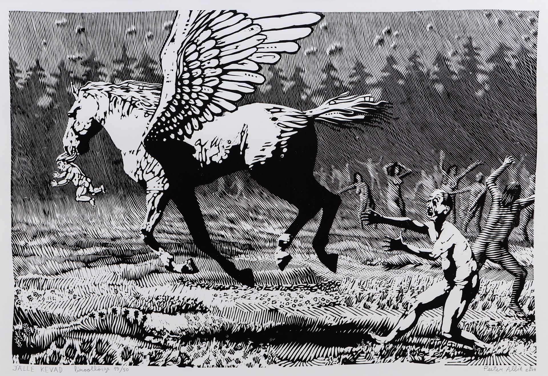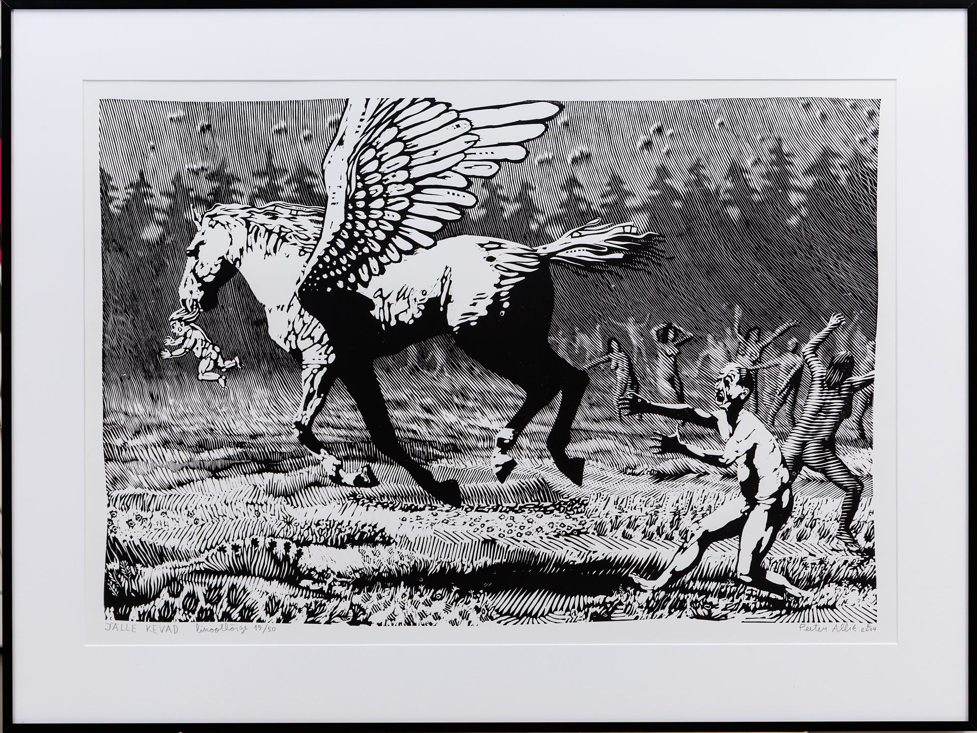 Peeter Allik (1966-2019) 1 Jälle kevad 2004 „Jälle kevad“ ühendab kunstnikule omase piibliliku, mütoloogilise ja poliitilise kujundikeele, viidates elu, surma ja tsüklilisuse paratamatusele. Joanna Hoffmann on meenutanud kunstnikku: “Tema ateljees valitseb töine kaos, milles nähtavasti vaid kunstnik ise vabalt orienteerub. Teisalt aga peegeldavad Alliku teosed süvenemist, perfektsionismi ja meisterlikkust. Ka aastakümnete pikkune andumine kunstnikukarjäärile, mida tõendab omandatud haridus, aktiivne näitustel osalemine ja rohke teoste hulk, on muljetavaldav - see ei ole niisama tulnud, üle jala. See on põhjalik pühendumine.” Teos on reprodutseeritud Tartu Kunstimuuseumi näitust “Peeter Allik. Kureeritud skisofreenia” saatnud raamatus “Peeter Allik” lk 228. Käesolev teos oli eksponeeritud Peeter Alliku graafikanäitusel 2004. aastal Estonia kontserdisaalis.