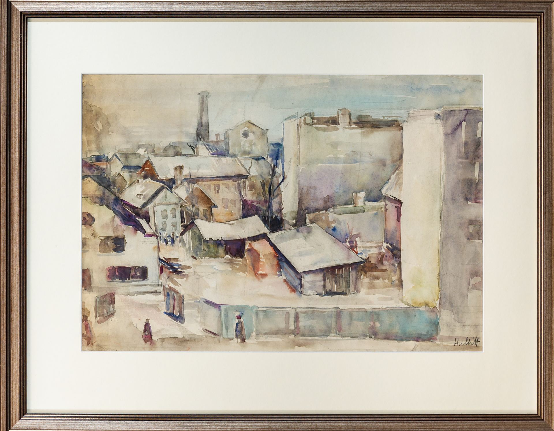 Hugo Mitt (1926–1998) 31 Linnavaade Akvarell, paber Hugo Mitt on tuntud eeskätt graafiku ja raamatukujundajana ning ta on vabagraafikas loonud valdavalt asjalikus realistlikus laadis maastikke ja linnavaateid. Graafika kõrvalt tegutses Mitt aga ka maalikunstnikuna. “Hugo Mitt on inimene, kes tunnetab oma missiooni. Seepärast polegi ta teosed juhuslikud hetkefikseeringud, vaid suure südamesoojusega paberile kantud nägemused oma rahvast ja oma maast — olgu vaevalisest, kidura taimestikuga, värvivaesest, maadligi majadega — aga ikkagi armsast. [...] Just see oskus näha inimest, inimese ilu ja suurust, tähenduslikkust veetleb Hugo Miti loomingu puhul ja seda ka siis, kui me ei näegi konkreetselt inimest ennast, vaid kasvõi tema kätega loodut-kasvatatut — elupaiku, maju, põlde, metsi, lilli,” on kirjeldanud Miti teoseid kunstiajaloolane Ira Einama.