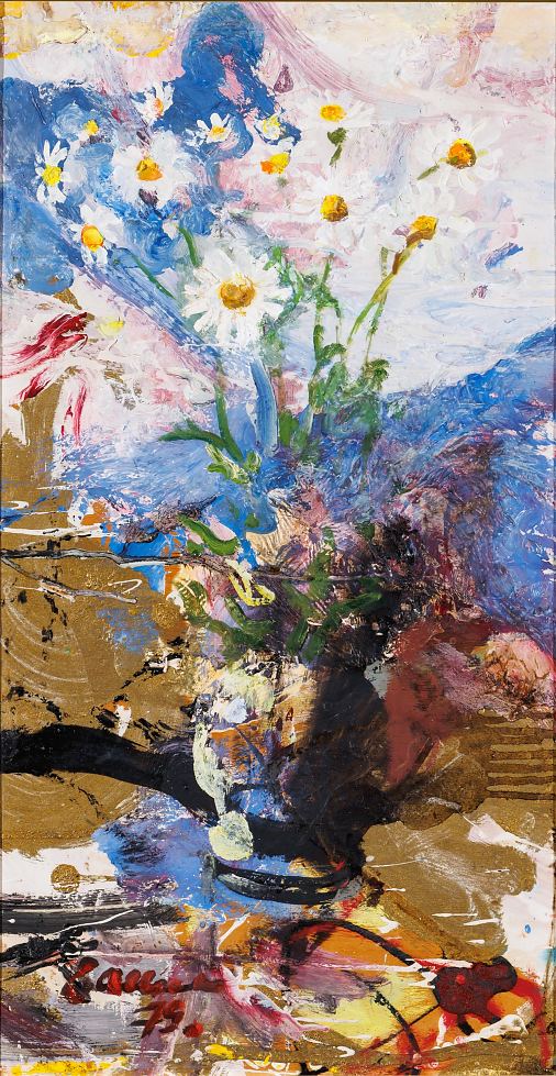 Efraim Allsalu (1929–2006) 3 Lilled 1979 Efraim Allsalu teoste keskmes on sageli inimene ja argielu, kuid Allsalu oli tuntud ka oma lillemaalide poolest, mis saavutasid 1960.–1970. aastatel erilise küpsuse. Lillekompositsioon ei anna edasi mitte ainult looduse ilu, vaid suuremat emotsiooni ja eluenergiat. Mare Ruus on kirjutanud 1977. aastal Allsalu lillemaalide kohta: “Värvide romantikat ja sära imetledes loob Allsalu sestpeale hoopiski rohkem lillemaale. On ju selles ¾anris värvil omaette vabadus valla. Konkreetse ja täpse natüürmordiseadeldisega ta end ei kammitse, ta parimad lillemaalid on pigem romantilised improvisatsioonid, mille taustas püüavad vahel nägemusteks saada vanad varemed või sinised kaugused. Maalija üks suuremaid rõõme on rõõm omaloodud, orgaaniliselt kokkukuuluvast ja emotsionaalsest värvidemaailmast.”