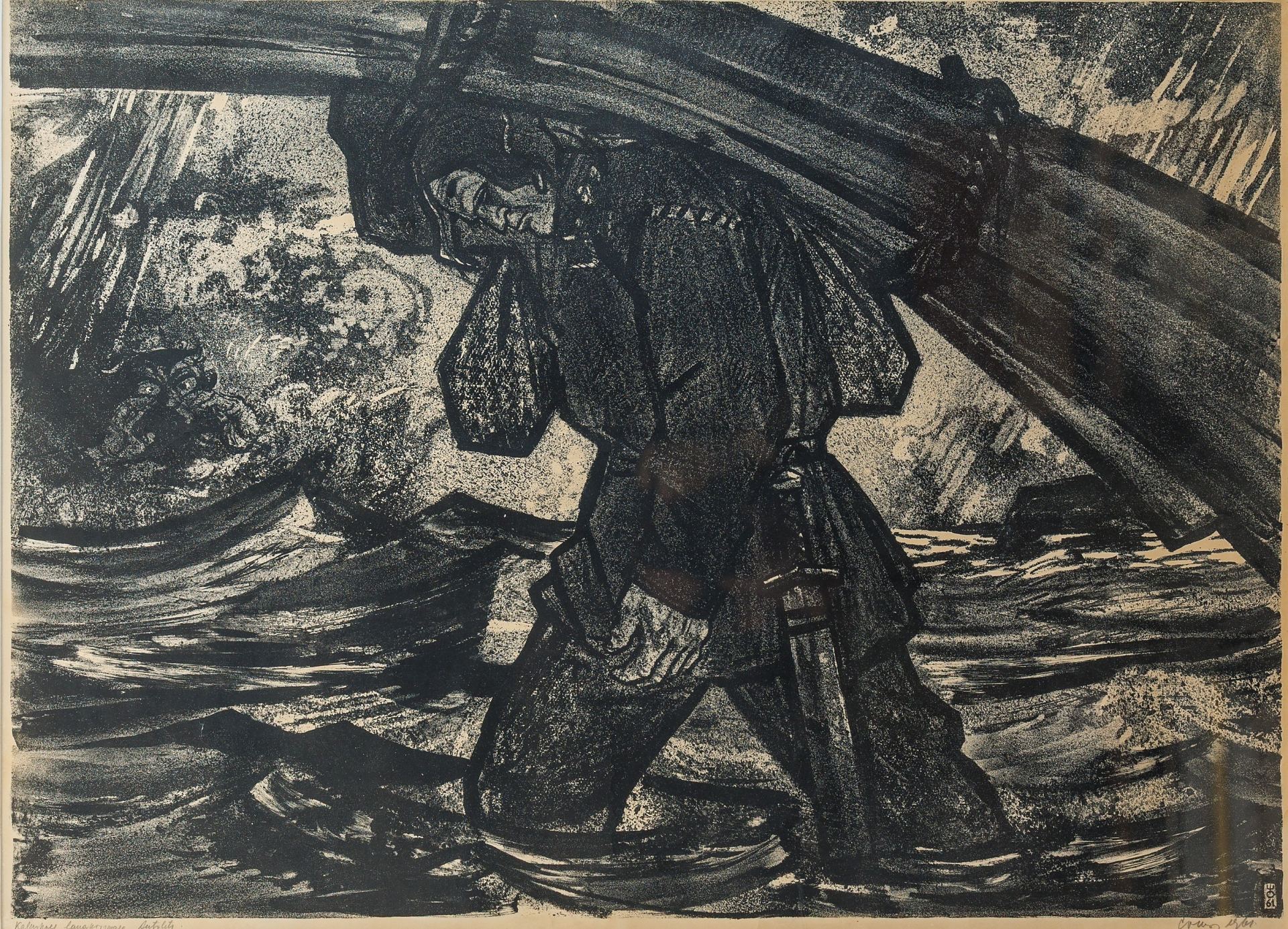 Evald Okas (1915-2011) 40 Kalevipoeg lauakoormaga 1961 1961. aastal valmisid Evald Okasel illustratsioonid Eesti rahvuseepose “Kalevipoeg” juubeliväljaandele. Nendest raamatuillustratsioonidest kasvasid välja suured vabagraafilised lehed. Ants Juske on kirjutanud: “1960. aastal esitas ta neist Tallinna Kunstihoones tutvumiseks ja lõpliku valiku tegemiseks ligi kakssada lehte. See oli suur proovikivi, sest ees oli juba mitu väljaannet eesotsas Kristjan Raua 1935. aasta luksustrükisega. Okas valis täiesti uue lähenemise, milles realismi asendas tuntav ekspressiivsus, mis avaldus joone ja tonaalsuse kui omaette graafiliste väärtuste rõhutamises.”. Käesolev teos on esindatud KUMU graafikakogus ning esinenud 2018. aastal Eesti Kunstimuuseumi näitusel "Ajalugu pildis – pilt ajaloos".