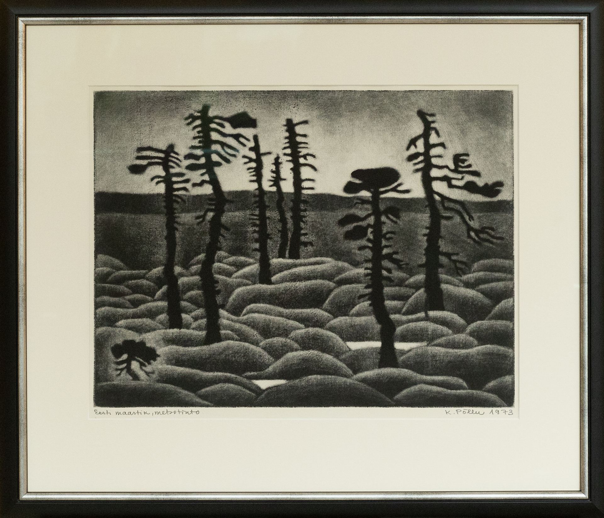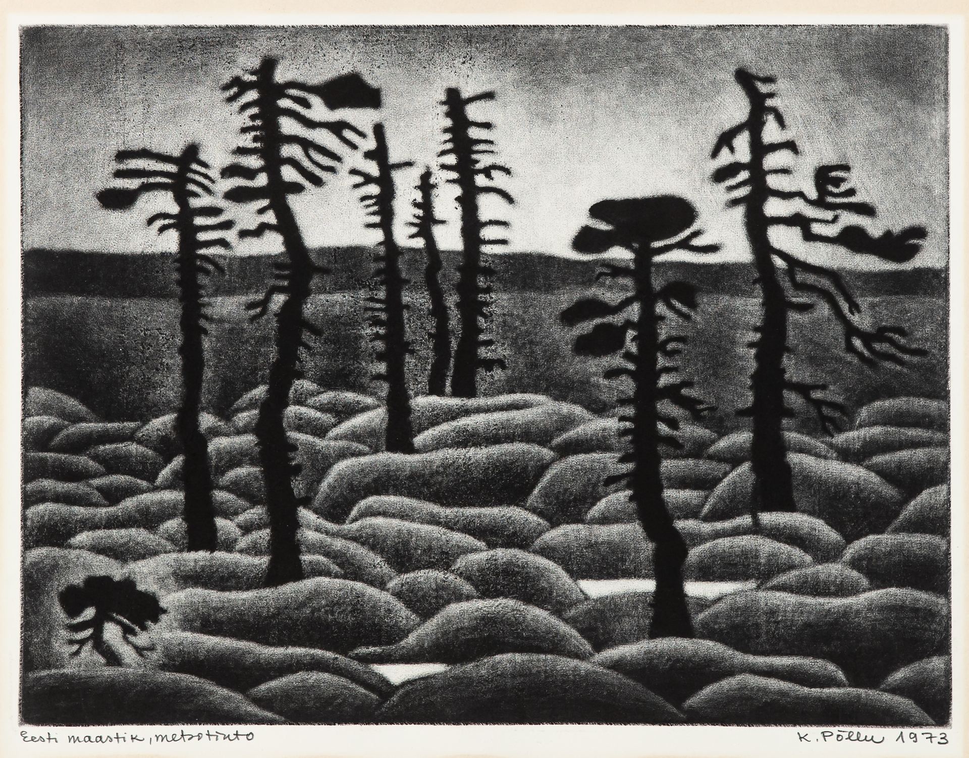 Kaljo Põllu (1934–2010) 46 Eesti maastik 1973 Kunstiteadlane Asu-Õunas on kirjutanud: “Esimene metsotintoleht (“Öö”) valmib Kaljo Põllul 1970. aastal ja Eesti maastikeks nimetatud töödega (neist esimene 1972.a.) algab metsotinto võidukäik kunstniku loomingus.” Põllu metsotinto-tehnikas loodud graafikasarjad on Eesti kunsti tüviteosed – omamoodi mütoloogilised portaalid, mille kaudu avanevad vaated muinasaega, looduse hingestatud väesse ja inimese ürgsesse kooskõlla ümbritseva maailmaga. Teos on KUMU graafikakogus ning esinenud mitmel näitusel (sealhulgas KUMUs).