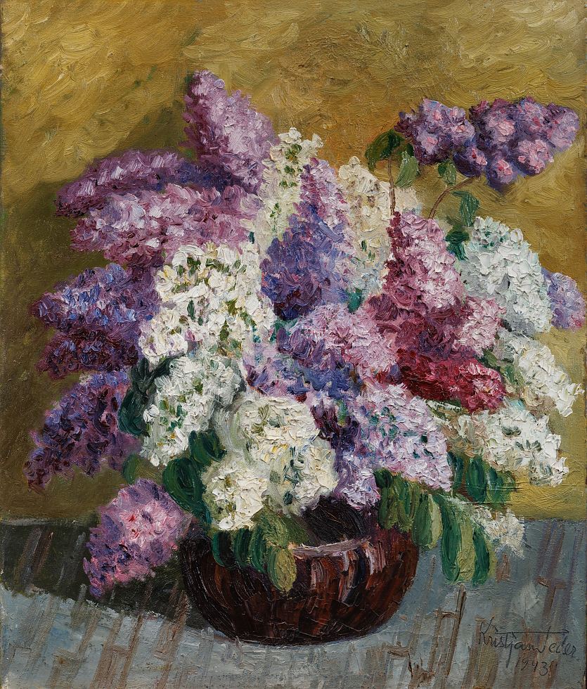 Kristjan Teder (1901–1960) 60 Sirelid 1943 Kristjan Teder seostub peaasjalikult lopsaka lilleküllusega. Tema lillelembus sai alguse Pallase õpingute (Pallases aastatel 1919–1925 Konrad Mäe juhendamisel ja 1933–1934 Ado Vabbe ateljees) järel Pariisis veedetud aastatel. Hiljem aianduse ja mesindusega tegelenud kunstnik jätkas rikkalike bukettide kujutamist ka stalinismi tingimustes, mil sotsrealismi sildi all nõuti küll hoopis teistlaadi loomingut. Kunstiajaloolane Voldemar Erm on kirjutanud: „1940. aastatel kujunevad välja kunstniku eelisainestik ja isikupärane käsitluslaad. Lillemaal muutub nüüd tema erialaks. Ikka rohkem kasutab kunstnik valgust täiskõlalise särava üldmulje saavutamiseks. [...] Vaevalt keegi teine eesti kunstnikest on olnud nii sügavalt ja siiralt võlutud lillede ilust, nende vahelduvast vormi- ja värvimängust, kui Kristjan Teder. "