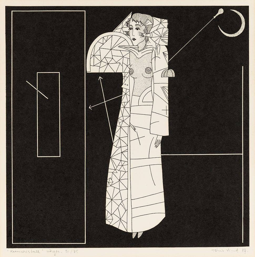 Tõnis Vint (1942-2019) 68 Kuukristall 1987 Kunstnik Leonhard Lapin on kirjutanud Tõnis Vindist kui oma õpetajast: “Analüütilise meelega Tõnis Vindil oli hea ettenägemisvõime – koos Meistriga vaadati räpasest olevikust tulevikku. Tõnis Vint kultiveeris oma loomingus rafineeritud esteetikat, kunstiametnikud heitsid seda talle ette. Seesugune meelelaad kandus üle paljudele õpilastele. Vindi õpetus ei piirdunud ainult kunstiga, vaid ta oli tõsiselt huvitatud arhitektuurist ja paljust muust. Meistri raamatukogu oli suur ja huvitav, ka külalised täiendasid seda pidevalt – teretulnud oli igasugune uus info mis tahes vallas. Tema kodus ei korraldatud joominguid ega orgiaid, Tõnis Vint oskas külalisi vaos hoida ja estetiseerida. Ta ei tülitsenud ega sõimelnud, aga ei sallinud lollust ja labasust. Ta õpetas meile selget meelt.”