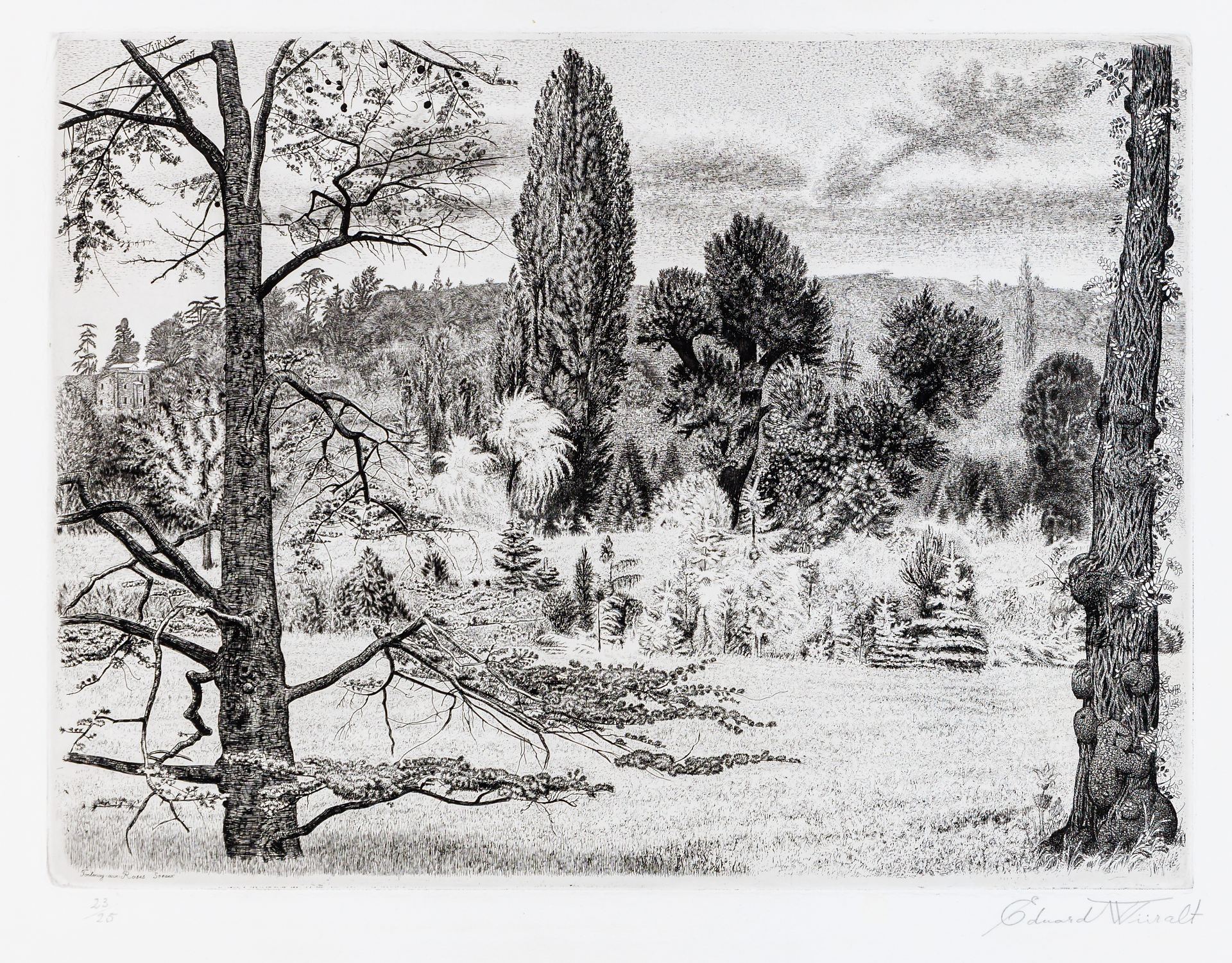 Eduard Wiiralt (1898-1954) 71 Maastik Pariisi lähedal 1937 Pärast Pallase lõpetamist ning lühikest perioodi seal graafikatehnikate õpetajana siirdus Wiiralt 1925. aastal Pariisi. Kunstiajaloolane Mai Levin on seal valminud graafilist lehte kirjeldanud nii: "Ofordis "Maastik Pariisi lähedal" kasvab otse pedantsuseni detailipeen natuurikujutus märkamatult üle lummavaks visiooniks. Esmapilgul võib näida objektivistlik-kiretuna see, kuidas ofordinõel jälgib puutüve mõhnu või okste hargnemist, siis aga täitub kõik salapärase eluga. Silm märkab pildiserval metsa ära eksinud üksikut maja – detail, mis aitab luua nõiutud paiga atmosfääri. [...] Sugestiivne meeleolu, tundlikkus ja tonaalne varjundipeenus on lehe peamised väärtused, ent selle kõrval annab ta edasi ka Pariisi ümbruse looduslikku omapära." Antud teos on reprodutseeritud Mai Levini monograafias "Eduard Wiiralt 1898–1954" (1998) nr 113 all. Käesolev teos on esindatud KUMU graafikakogus.
