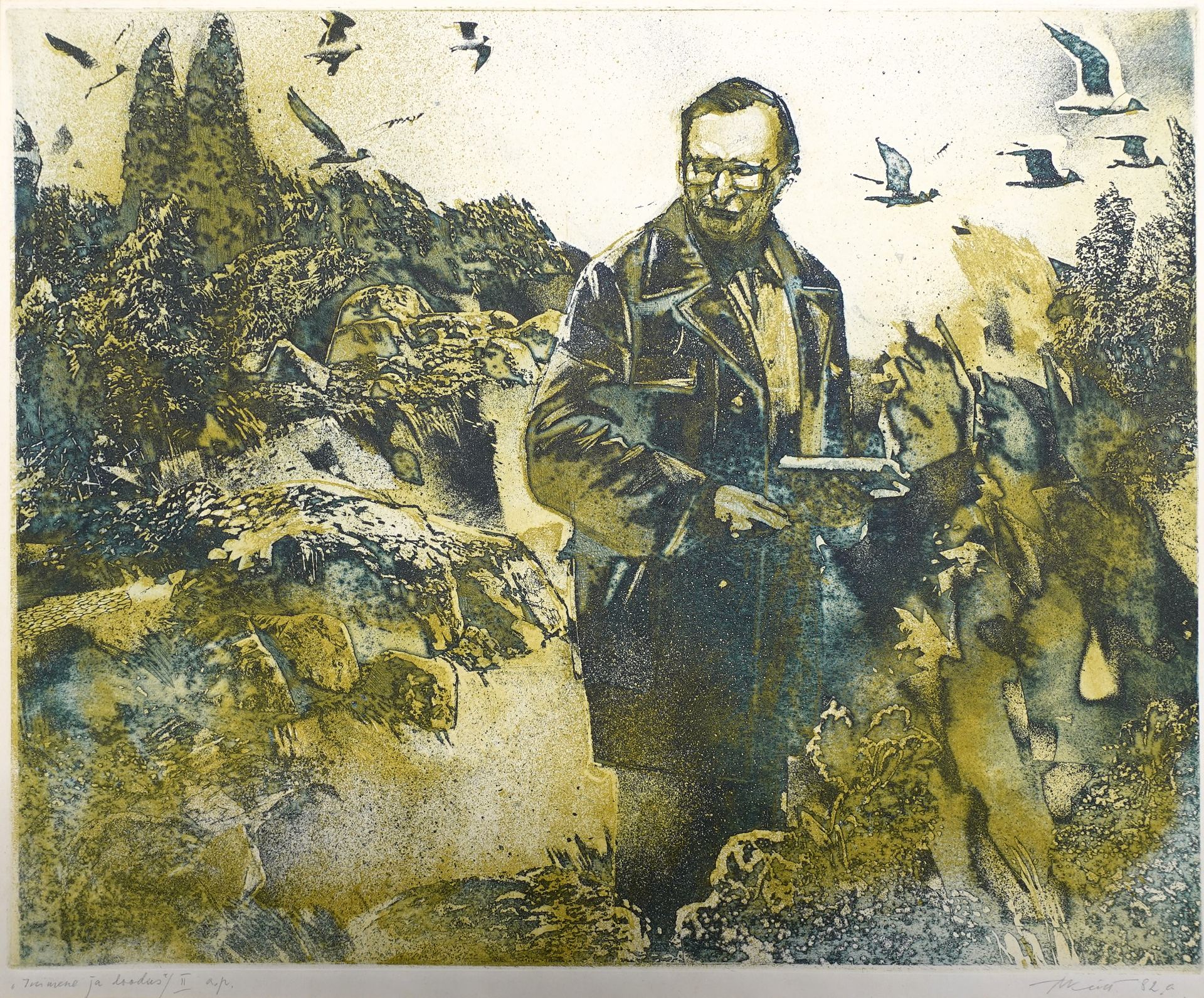 Allex Kütt (1921–1991) Inimene ja loodus 1982 Söövitus, paber Kunstnik on teosel kujutanud Jaan Eilartit looduses.