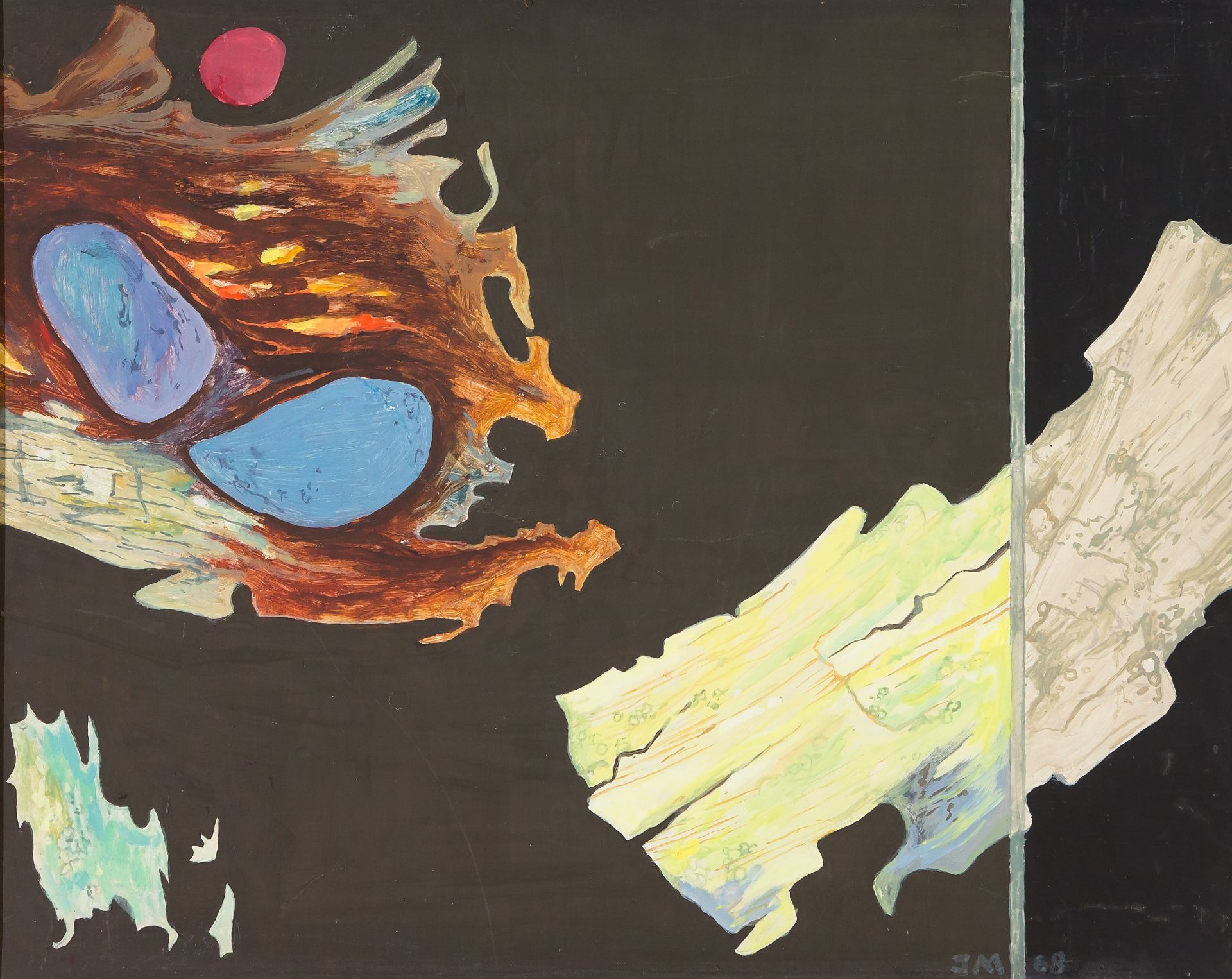 Ilmar Malin (1924-1994) Kaks vormi 1968 Tempera, masoniit „Mikroorganismidest inspireeritud kujundites vaatab I. Malin nüüd maailma nagu üldisemalt. Teoste nimetused on sageli abstraktsed üldmõisted. Ta maalid on otsekui mõtisklused elu ja looduse üldisematest seadustest, inimese ja kosmose seostest. Ta näib otsivat maailma lõpmatuse, elu imelise paljususe visuaalset sümbolit,“ on kirjutanud kunstiajaloolane Mare Ruus. Eha Ratnik on lisanud: „Malinit köidavad kontrastiprintsiibid – kontrastid värvides, vormides, rütmis. Ja neid tahab I. Malin viia maksimaalse piirini, ülima selguseni.“ Käesolev teos oli eksponeeritud kunstniku isikunäitusel Tartu Riiklikus Kunstimuuseumis 1973. aastal ning on ära toodud näitusekataloogi teoste nimestikus nr 34 all.