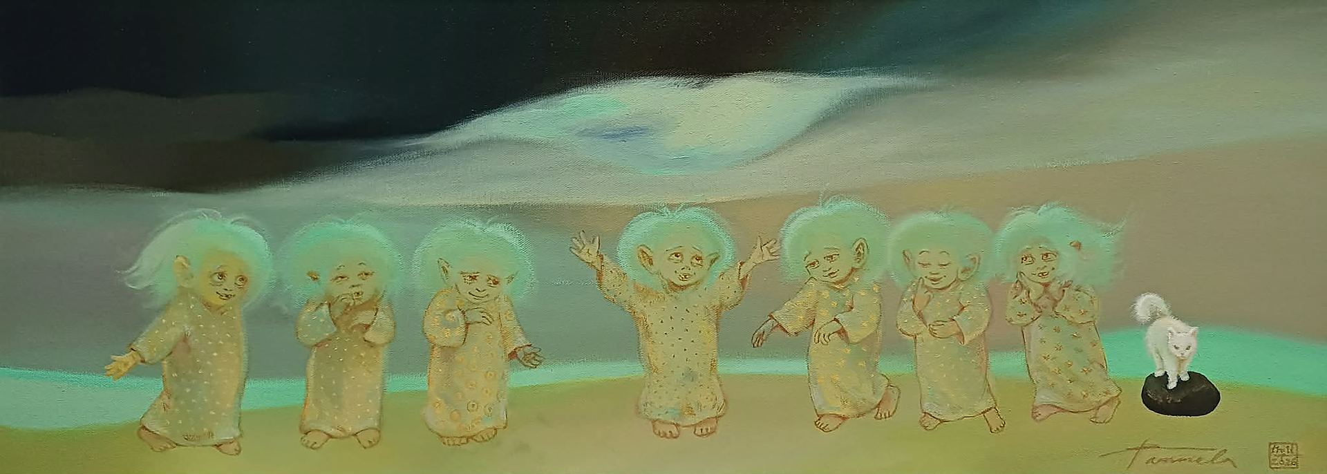 Pille Tammela (sünd 1971) Seitse trolli valge kassiga 2026 Õli, lõuend