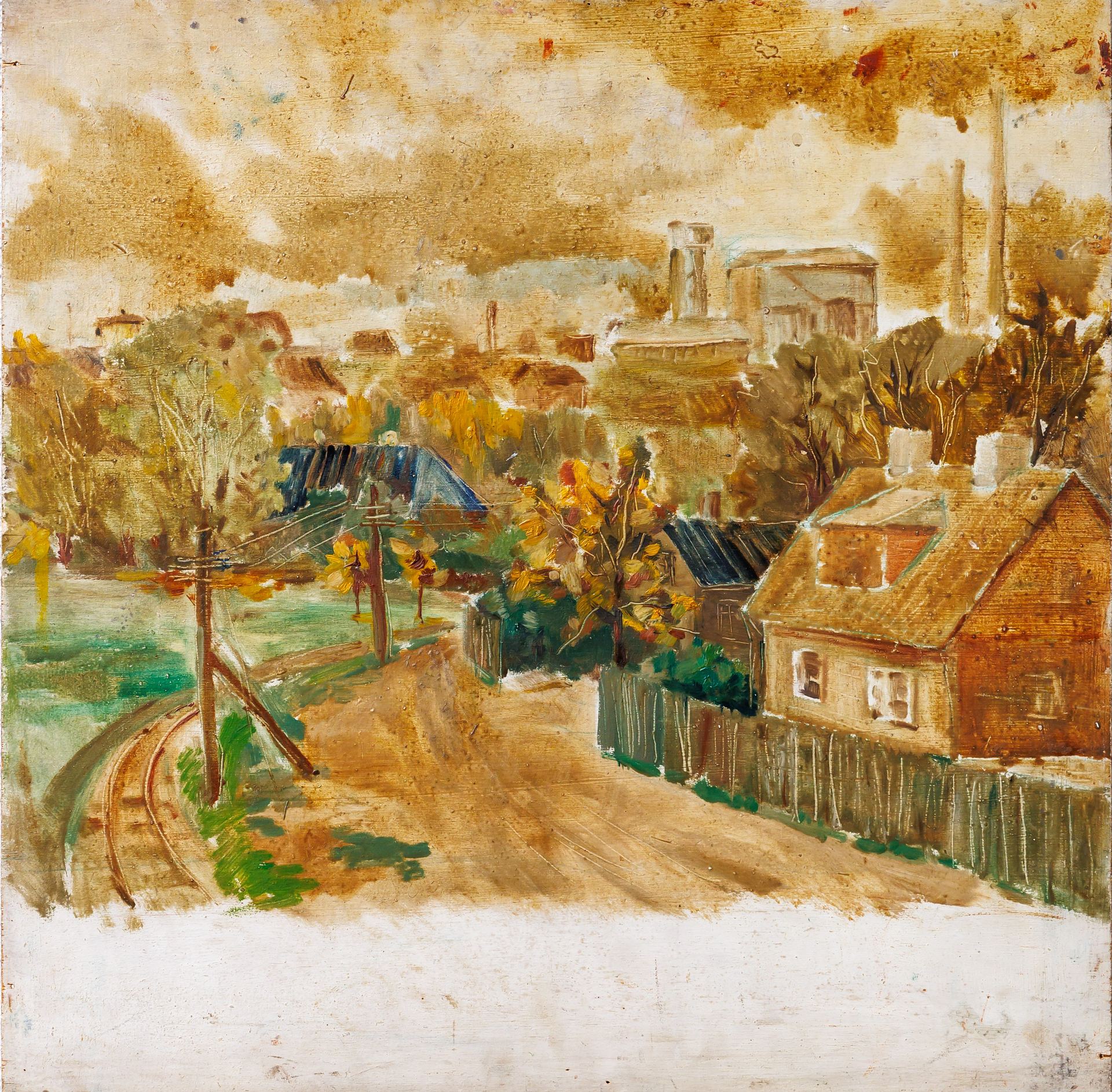 Teadmata autori kahepoolne õlimaal (u. 1944–1945) kannab endas sõjajärgsele Eesti kunstile omast rahutust ja dokumentaalset tundlikkust. Ühel pool on kujutatud Tallinna vanalinna, mille keskmes kõrgub torni kaotanud Niguliste kirik – vaade, mis viitab sõjapurustustele. Teisel poolel, heledamas koloriidis küljel avaneb linnavaade rongirööbaste või raudteetammiga, mis loob mulje argielu taaselustuvast rütmist. Teos meenutab oma koloriidi ja pintslitöö poolest kunstnik Nikolai Kulli loomingut. Maal pakub ainulaadse pilguheite ajajärku, mil Eesti linnad ja inimesed elasid ühtaegu läbi hävingut ja taastumise algust.