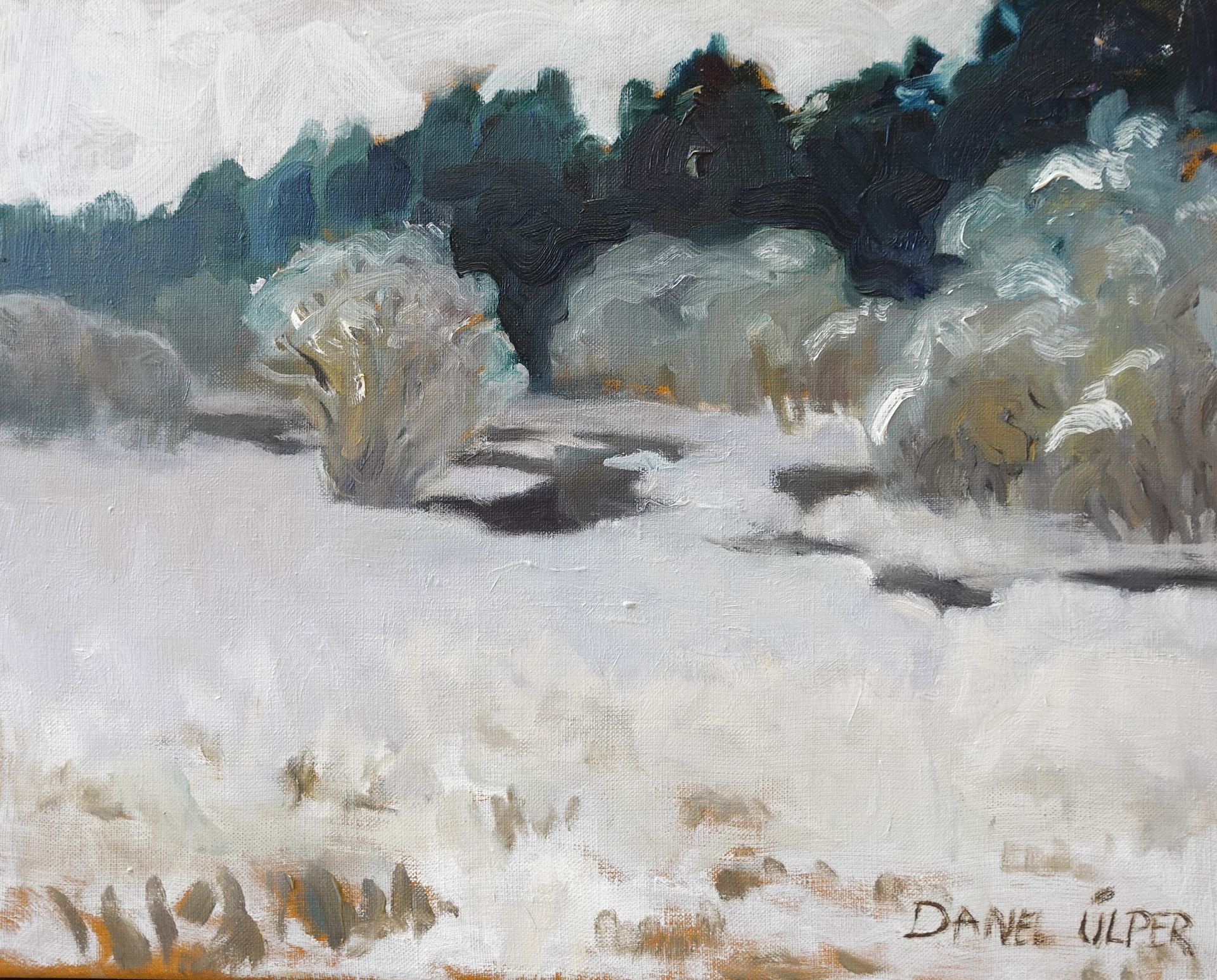 Talvine maastik jõega, Danel Kunstnik tegeleb mitme erineva projekti raames piiriäärse Lõuna-Eesti ja Põhja-Lätiga, süüvides ääremaa olemusse nii läbi kunstiloome kui hävimisohus hoonete ajaloolise interjööriviimistluse dokumenteerimise Talvine maastik jõega, Danel Ülper E-kunstisalongis Ülper Danel