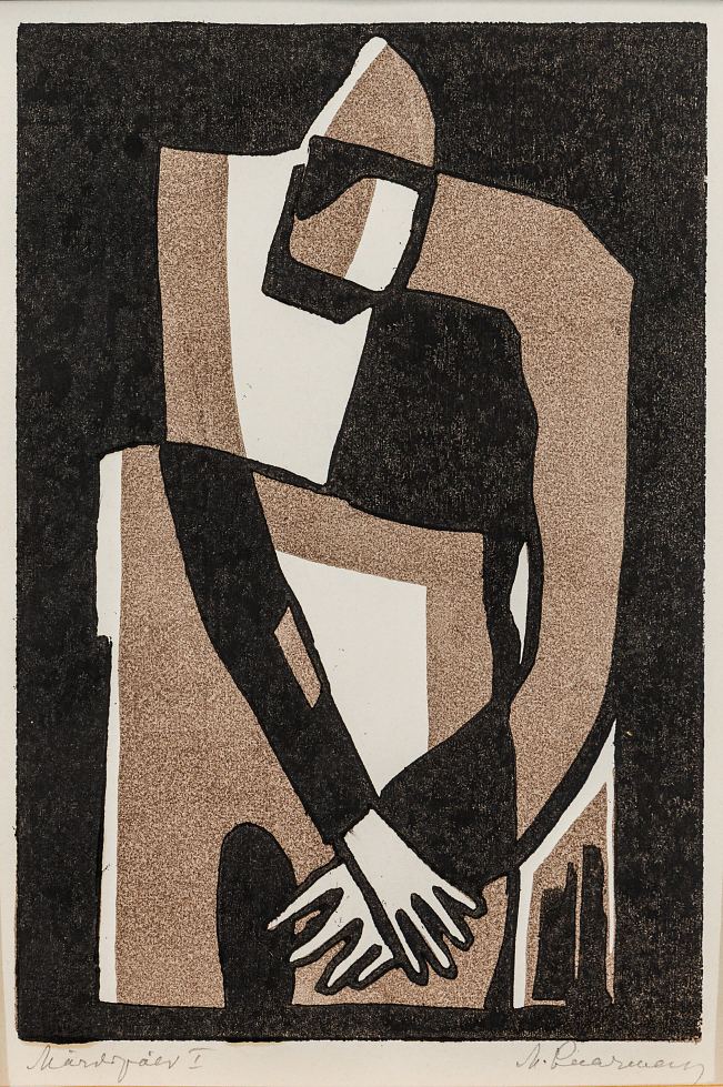 Märt Laarman (1896–1979) 20 Märdipäev I Linool, paber Esimese vabariigi ajal oli Märt Laar¬man Eesti Kunstnikkude Rühma üks asutajaid. Kubistlikku ja konstruktivistlikku kunsti propageerinud ning harrastanud rühmitus oli eesti kunstis uus ja esmakordne, huvitav ja vaidlusi tekitav. Kunstnik Märt Laarman on kirjutanud: "Minu uhkus on selles, et usun uut kunsti. Ma ei saa selle vastu, et hoian elava poole.” Hilisemal eluperioodil koostas ta linoollõigete mapi “Märdipäev” (1971–1973). Mai Levin on kirjutanud: “Kuigi kunstniku laad ei tardu ega kaota sugestiivsust viimasel elukümnendilgi, sulgub ta järjest tuntavamalt “oma maailma”. Laarman pigem uuris oma “nägusid”. 24-lehelise mapi avab rahulikus selguses eriti mõjuv kujund – “näota”, otsekui kõigi järgnevate “nägude” tundeskaala võimalusi endas kätkev figuur langetatud pea ja ristatud kätega. Lakoonilises kindlakäelises laadis lehtede õilsust tõstab taas õnnestunud, laarmanlikult jahe pruun toon.”