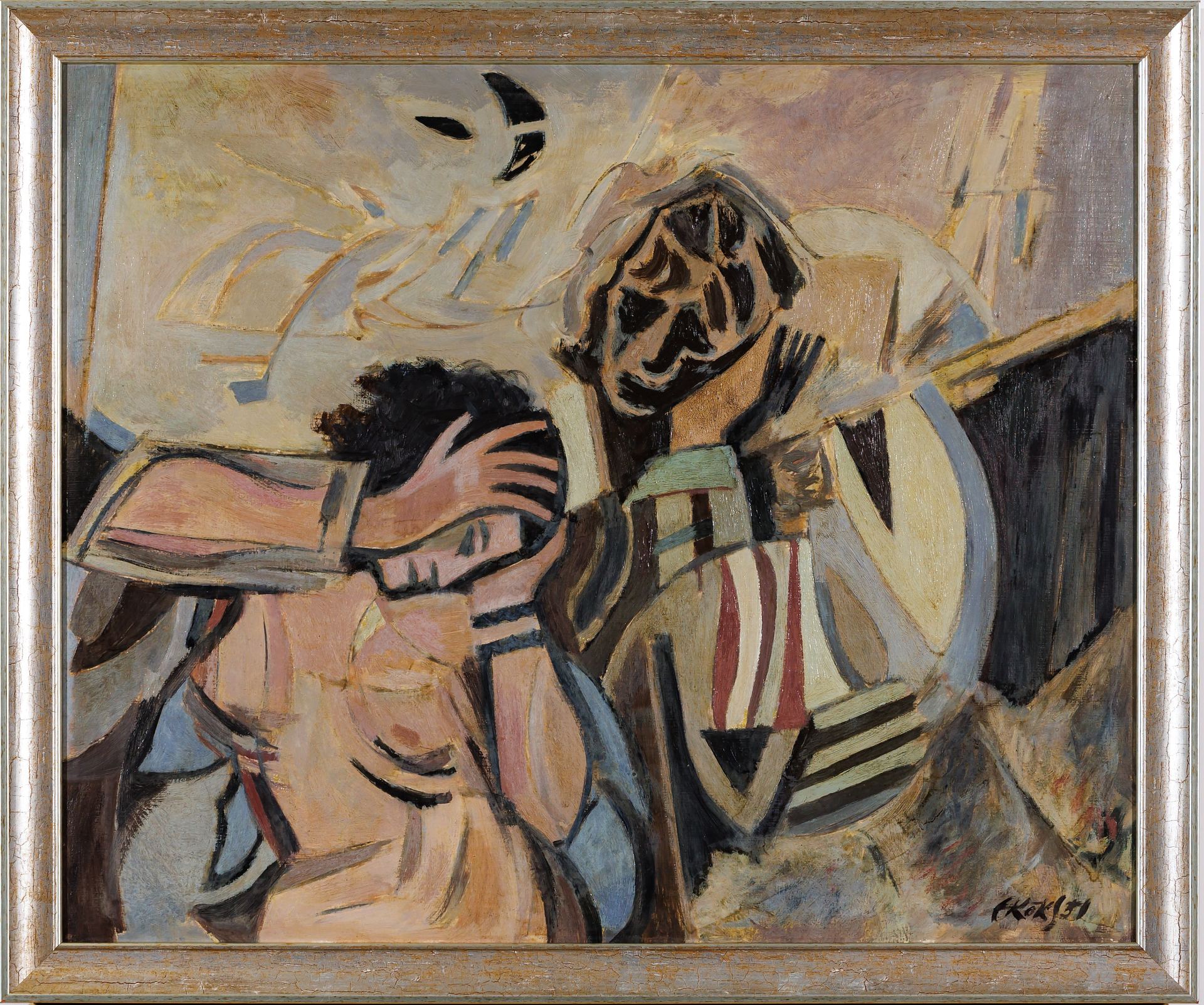 Endel Kõks (1912–1983) 20 Traagiline II 1951/taga 1961 Reet Mark on kirjutanud, et pärast 1950. aastal Rootsi kolimist algas Kõksi loomingus otsinguperiood. Suurde kolmikusse kuulunud Kõks eristus just sellepärast oma kaaskunstnikest Elmar Kitsest ja Leppo Mikkost, sest Rootsis avanes Kõksile kiirelt arenev globaalne kunstimaailm. Nende aastate teostele on omane Margi sõnul “piiripealne abstraktsus, kus objektid on hajusad, kuid veel selgelt äratuntavad”. Kunstiteadlane Eevi End on märkinud, et suur osa Kõksi selle perioodi teostest on figuraalsed ning toob näiteks just “Traagika”, mis on käesoleval oksjonil osaleva teose eelkäija.