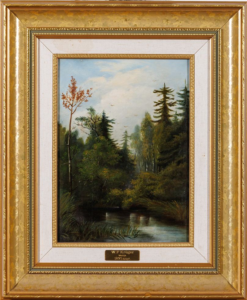 Woldemar Krüger (1808 - 1894) 22 Maastik 1871 Woldemar Krüger sündis 1808. aastal Kaave mõisas Tartumaal. Tartusse elementaarkooli saadetud Krügeri võttis Raadi mõisaproua von Liphart oma pojale Carl Eduardile, tulevasele kunstiteadlasele kaaslaseks. Poisid õppisid koos kuni gümnaasiumi lõpetamiseni. Ei ole imeks panna, et Krüger täiesti saksastus. Hiljem astus Krüger Tartu Ülikooli filosoofiateaduskonda ning kunstiõpingud viisid teda Eestist eemale Saksamaale ja Itaaliasse. Kunstiajaloolane Kadri Asmer on kirjutanud: “Krügeri looming esindab peamiselt biidermeierlikku realismi. Läbivalt kohtab tema loomingus portree- ja maastikumaali. Krüger oli erakordselt andekas portretist, kes suutis tabada inimese olemust oma ajas.” 1842. aastal laskis ülikooli aulas kontserdi andnud Franz Liszt ennast Krügeril portreteerida. Liszti portreel on komponisti enda poolt joonistusele kirjutatud autogramm. 1857. aastal sai Krüger Peterburi Keiserliku Kunstide Akadeemia akadeemikuks ning 1858. aastal keiserliku Tartu Ülikooli Joonistuskooli juhatajaks kuni selle kooli sulgemiseni 1891.