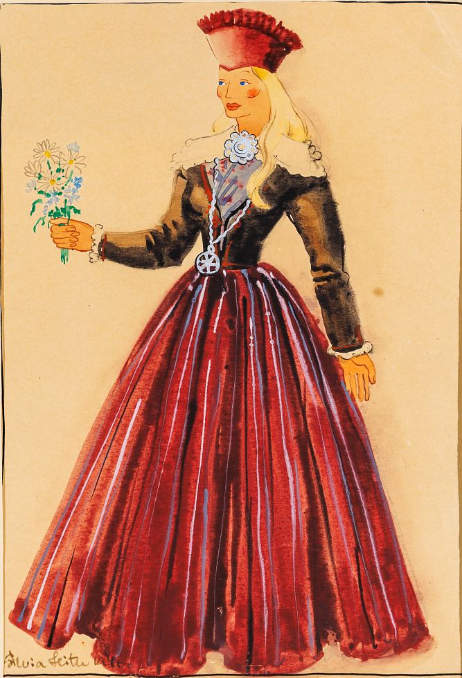 Silvia Leitu (1912-1969) 23 Pärnu-Jaagupi neiu Akvarell, paber Silvia Leitu astus 1931. aastal Pallasesse ning lõpetas 1939. aastal Nikolai Triigi õpilasena. 1938 omandas samas joonistusõpetaja kutse. Töötas alates 1936. aastast õpingute kõrvalt Vanemuises kostüümikunstnikuna ning lõi eritellimusel uhkeid tualette seltskonnadaamidele. 1939. aastal kutsuti kunstnik Estoniasse, kus ta töötas 1941. aasta alguseni. 1944. aastal lahkus Eestist ning jätkas õpinguid 1944–1946 Müncheni Kunstiakadeemias Emil Preetoriuse juhendamisel. Pärast lõpetamist töötas Kammerspile teatris kostümeerija ning kostüümikunstnikuna. Siirdus 1953. aastal Stockholmi, kus tegeles raamatute illustreerimisega, tegi moekavandeid ja ruumikujundusi. Esines rahvusromantiliste akvarellkompositsioonidega paljudel välis-eesti kunstinäitustel.