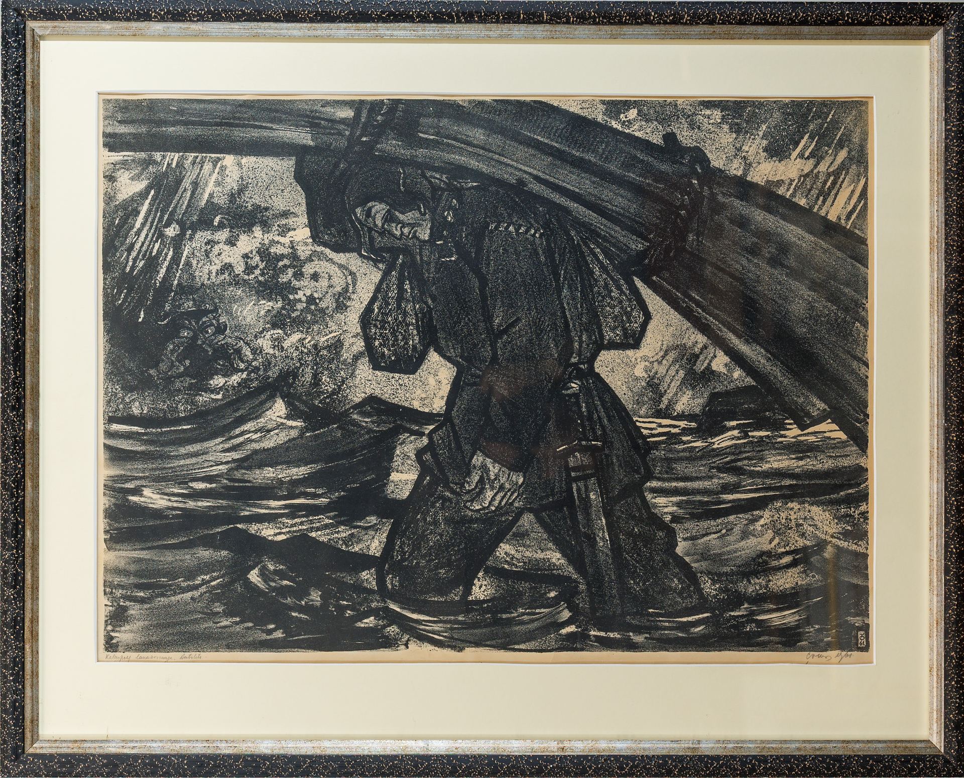 Evald Okas (1915-2011) 40 Kalevipoeg lauakoormaga 1961 1961. aastal valmisid Evald Okasel illustratsioonid Eesti rahvuseepose “Kalevipoeg” juubeliväljaandele. Nendest raamatuillustratsioonidest kasvasid välja suured vabagraafilised lehed. Ants Juske on kirjutanud: “1960. aastal esitas ta neist Tallinna Kunstihoones tutvumiseks ja lõpliku valiku tegemiseks ligi kakssada lehte. See oli suur proovikivi, sest ees oli juba mitu väljaannet eesotsas Kristjan Raua 1935. aasta luksustrükisega. Okas valis täiesti uue lähenemise, milles realismi asendas tuntav ekspressiivsus, mis avaldus joone ja tonaalsuse kui omaette graafiliste väärtuste rõhutamises.”. Käesolev teos on esindatud KUMU graafikakogus ning esinenud 2018. aastal Eesti Kunstimuuseumi näitusel "Ajalugu pildis – pilt ajaloos".