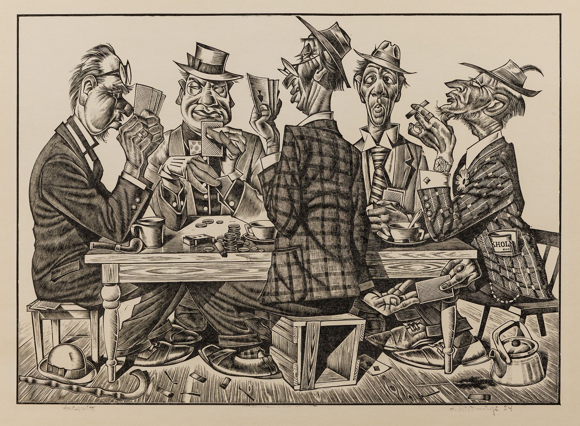 Aleksander Ristmägi (1902–1972) 54 Kaardimängijad 1954 Ristmägi alustas kunstiõpingutega 1921. aastal Ants Laikmaa ateljeekoolis. Ta jätkas õpinguid 1940. aastal Pallases, mille lõpetas 1943. aastal Ado Vabbe õpilasena. Esines esmakordselt kunstinäitusel 1937. aastal. Kaalu Kirme on näitusest tagasivaatavalt kirjutanud: „Tajutav on terav erinevus Ristmäe akadeemilise stiili ja teiste kunstnike vaba käsitluslaadi vahel. /.../ Tekib isegi mõte, kas Ristmägi siiski Venemaal mingit kunstiharidust ei saanud – sama joonistuse ja perspektiivi laitmatus, sama motiivistik.“ Ristmägi joonistas ka karikatuure Meie Matsi, Esmaspäeva ning huumori- ja pilkealbumisse Pisuhänd. 1944. aastal emigreerus Ristmägi Rootsi, kus osales aktiivselt väliseesti näitustel Stockholmis.