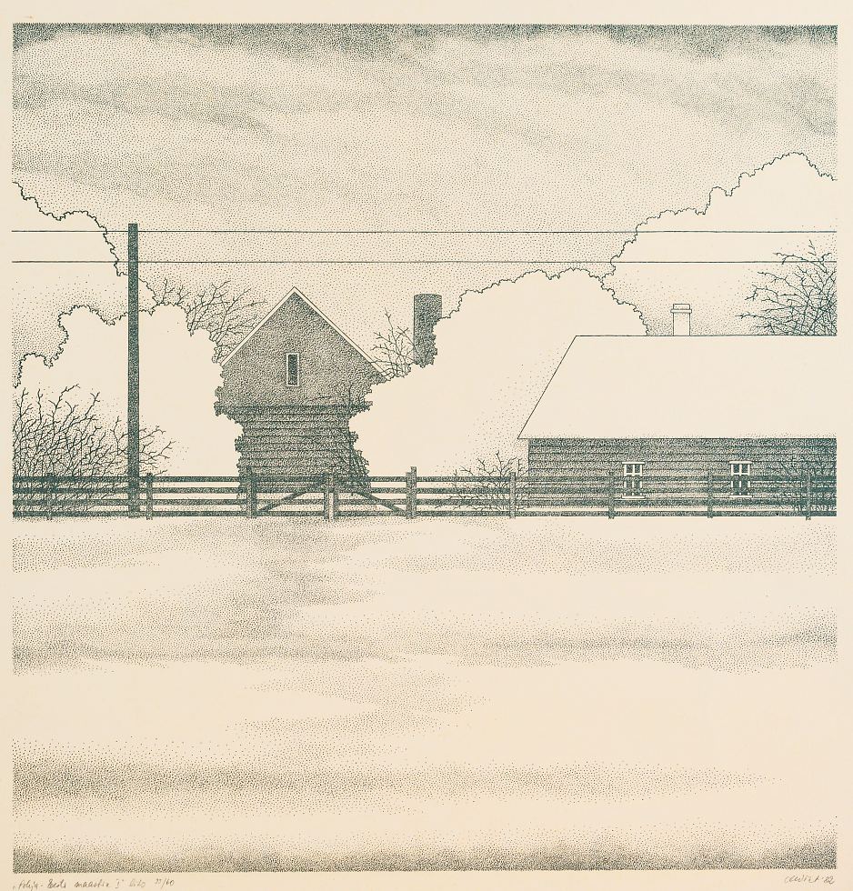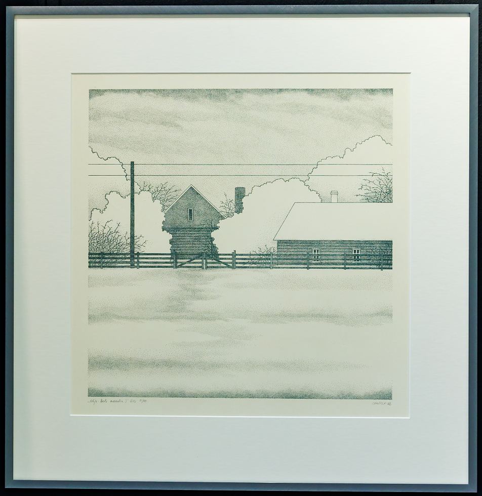 Mare Vint (1942-2020) 67 Põhja-Eesti maastik 1982 Mare Vint õppis ERKI-s 1962–1967 klaasikunsti erialal. Arhitektuurielementide ja looduse koosmõjust Mare Vindi loomingus on kirjutatud kunstiajaloolane Sirje Helme: „Oma süsteemse ilukontseptsiooni lõi Vint maastiku- ja linnamotiivides. Ta võis läheneda realismile ja motiivi esitamise poolest saabki ta töid pidada realistlikeks, kuid seda tasakaalustab kindlapiiriline, ehk koguni jäik motiivi allutamine korra ja harmoonia ideele, tasakaal looduse ja arhitektuuri vahel.“ Käesolev graafiline leht on reprodutseeritud Eha Komissarovi koostatud teoses „Mare Vint“ (1991) nr 58 all.