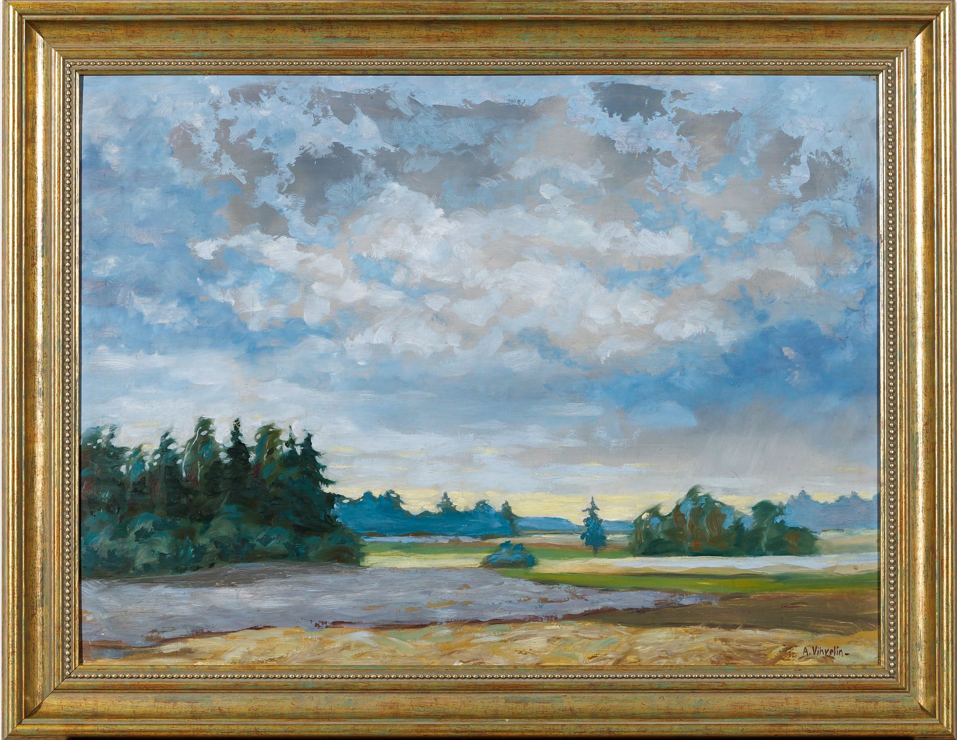 Arnold Peeter Vihvelin (1892–1962) 68 Pilvine ilm 1940ndad? Õli, vineer Arnold Vihvelin sündis Rääbise mõisas metsavahi pojana, kus loodus oli tema jaoks igapäevane ja loomulik osa elust. Tema isa Hans Vihvelin kogus rahvalaule ja saatis neid Kreutzwaldile ning nende kodus oli märkimisväärne raamatukogu, mis lõi tugeva kultuurilise tausta. Soodsas keskkonnas alustas ta maalimist juba kuuendal eluaastal. Kunstihariduse sai Vihvelin mitmete tunnustatud kunstnike ja õppejõudude käe all, sealhulgas Rudolf Julius von zur Mühlen, Kristjan Raud, Arkadi Rõlov ning Peterburi Kunstiakadeemia kõrgema kunstikooli professor V. Maté.