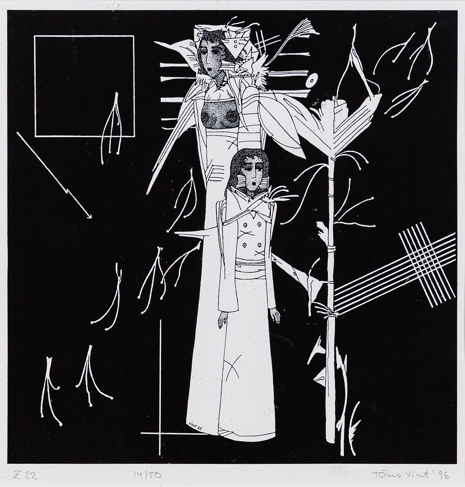 Tõnis Vint (1942-2019) 72 Z 22 1996 Kunstiteadlane Elnara Taidre on kirjutanud: “Kummastavat efekti Vindi töödes on soodustanud tundelised, kohati avameelselt erootilised naiskujutised. Hedonistliku meeleolu kõrval täitis erootiline naiskuju tähelepanu köitja psühholoogilist rolli: olukorras, kus alastus võis kaasa tuua nõukogude tsensuuri süüdistuse pornograafias, omandas see paradoksaalselt poliitilise tähenduse.” Graafiline leht on sama seeria töö nagu „Z6”.