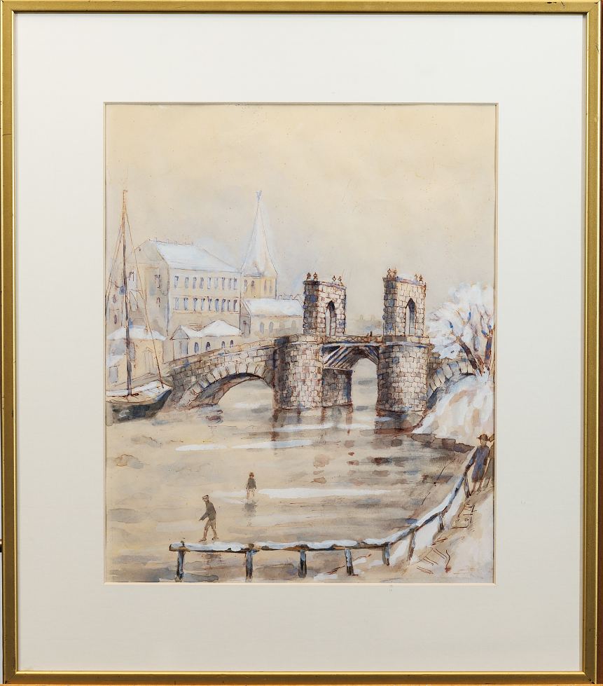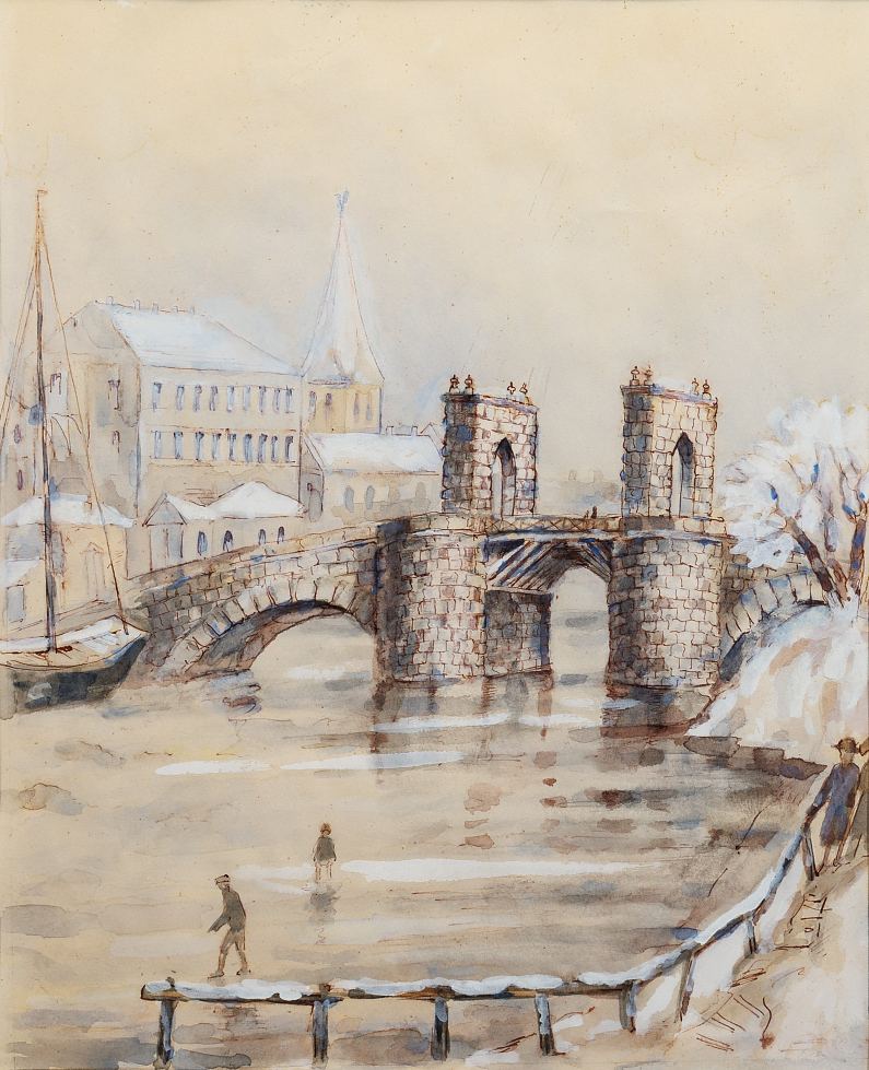 Hilda Kamdron (1901-1972) 9 Kivisild talvel Akvarell, paber Hilda Kamdron alustas õpinguid Pallases 1922. aastal, õppides seal kuni 1930. aastani. 1944. aastal hävinud Pallase asemele tehti Tartu Riiklik Kunstiinstituut, mille Kamdron lõpetas 1946. aastal graafikuna. Hilda Kamdroni teoseid on säilinud vähe ning põhiliselt on need 1960. aastate Tartu vaated, mis valminud hariliku pliiatsi ja mõnel harval juhul ka värvipliiatsite või akvarellidega. Kamdroni loomingus leidub eelkõige jäädvustusi sõjapurustustest Tartus, sealhulgas ka hävitatud Kivisillast. Käesolev teos mõjub tema hilisema loomingu kõrval helge ja lootusrikkana, pakkudes võimalust heita pilk Tartu minevikku enne sõda.
