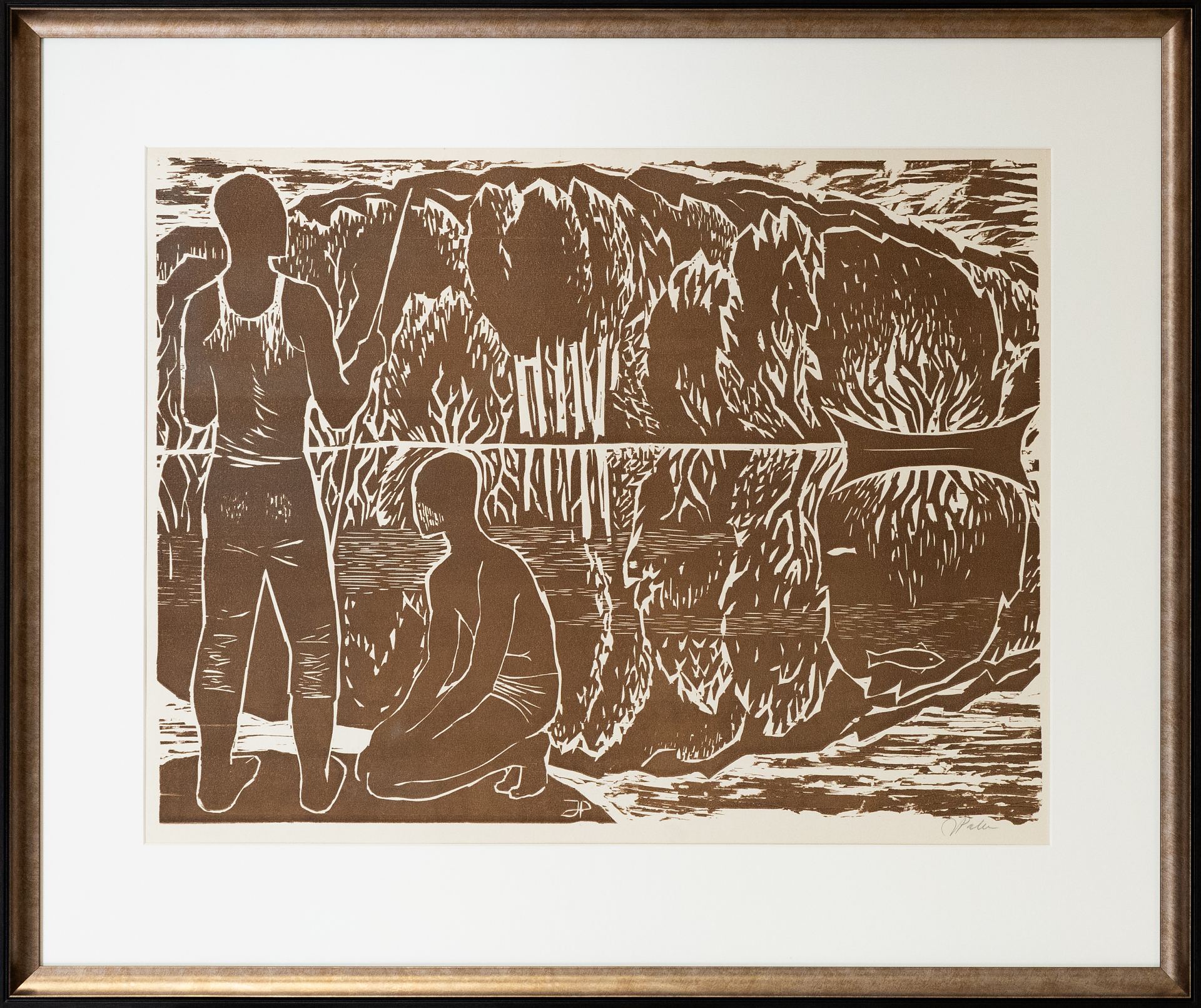 Jüri Palm (1937-2002) Kala püüdmas 1964 Puulõige, paber Jüri Palm alustas kunstiõpinguid 1957. aastal Eesti Riiklikus Kunstiinstituudis keraamika erialal. Lõpetas 1963. aastal graafik-plakatistina. Kunstiteadlane Jüri Hain on kirjutanud: „Jüri Palm lõpetas Kunstiinstituudi 1963. aastal, kuid oli äratanud oma vabagraafikaga tähelepanu juba mõned aastad varem. Tema loomingulaadile on omane jõuline lahendus ja liigseid detaile hülgav vorm. Meie graafikute poolt vähetarvitatavas puulõike tehnikas lõi Palm 1964. aastal huvitava vaatenurga alt nähtud, rahuliku, peaaegu piduliku meeleoluga „Kala püüdmas. Teos „Kala püüdmas“ on reprodutseeritud kogumikus „Eesti graafika 1963–1964“ (1966) lk 45 ning ajakirjas „Kunst“ (1966/3) lk 28. Jüri Palmi graafiline leht “Kala püüdmas” kuulub Eesti Kunstimuuseumi graafikakogusse.