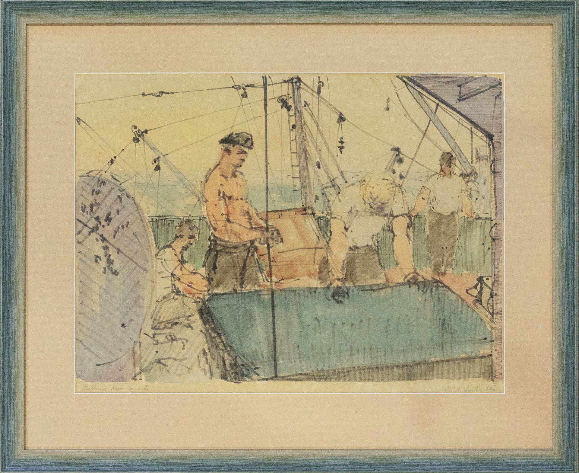 Priidu Aavik (1905 - 1991) Katrina rannavetes 1965 Akvarell, paber Äratuntava elavuse ja impulsiivsuse saavutas Priidu Aavik oma loomingus 1960ndate algul, mil kunstnik viibis korduvalt pikematel loomingulistel ekspeditsioonidel merel. Esimene pikem retk kulges Atlandi ookeani põhjaosas ning teine lääne- ja lõunaosas ekvaatorini välja, mille jooksul joonistas ta üles nii eksootilisi rannikuid kui ka meremeeste eluolu. Hoolimata suurest reisikirest tõdes ta pärast 1965. aasta reisi Põhja-Aafrikasse, et sealne „taevas oli tühi ning avar, nagu teatridekoratsioon, looduse värvid on alati ühed ja samad, päeval eredad, öösel sinakasmustad. /---/ Põhjamaa pakub silmale hoopis suuremat vaheldust.“ Priidu Aaviku lemmikmodelliks oli ja jäi siinne loodus ning inimene. Eriline koht selles kuulus just kaluritele ja rannaelule.
