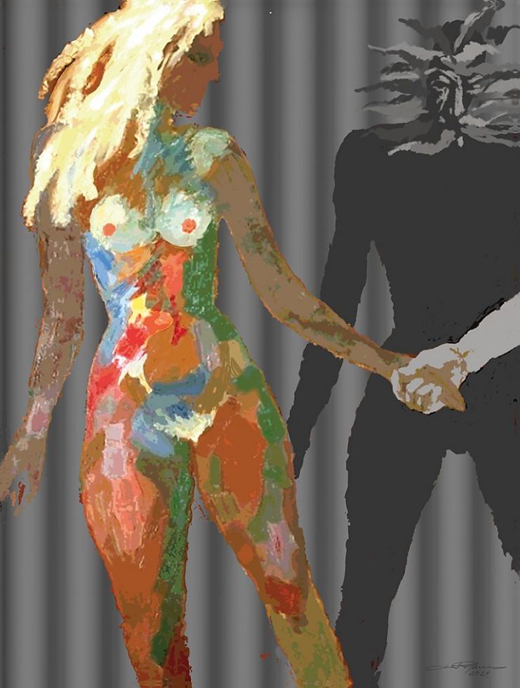 Enn Põldroos (sünd 1933) Kokkulepe värvilise ja mustvalge maailma vahel 2019 Digimaaling,lõuend 7/25
