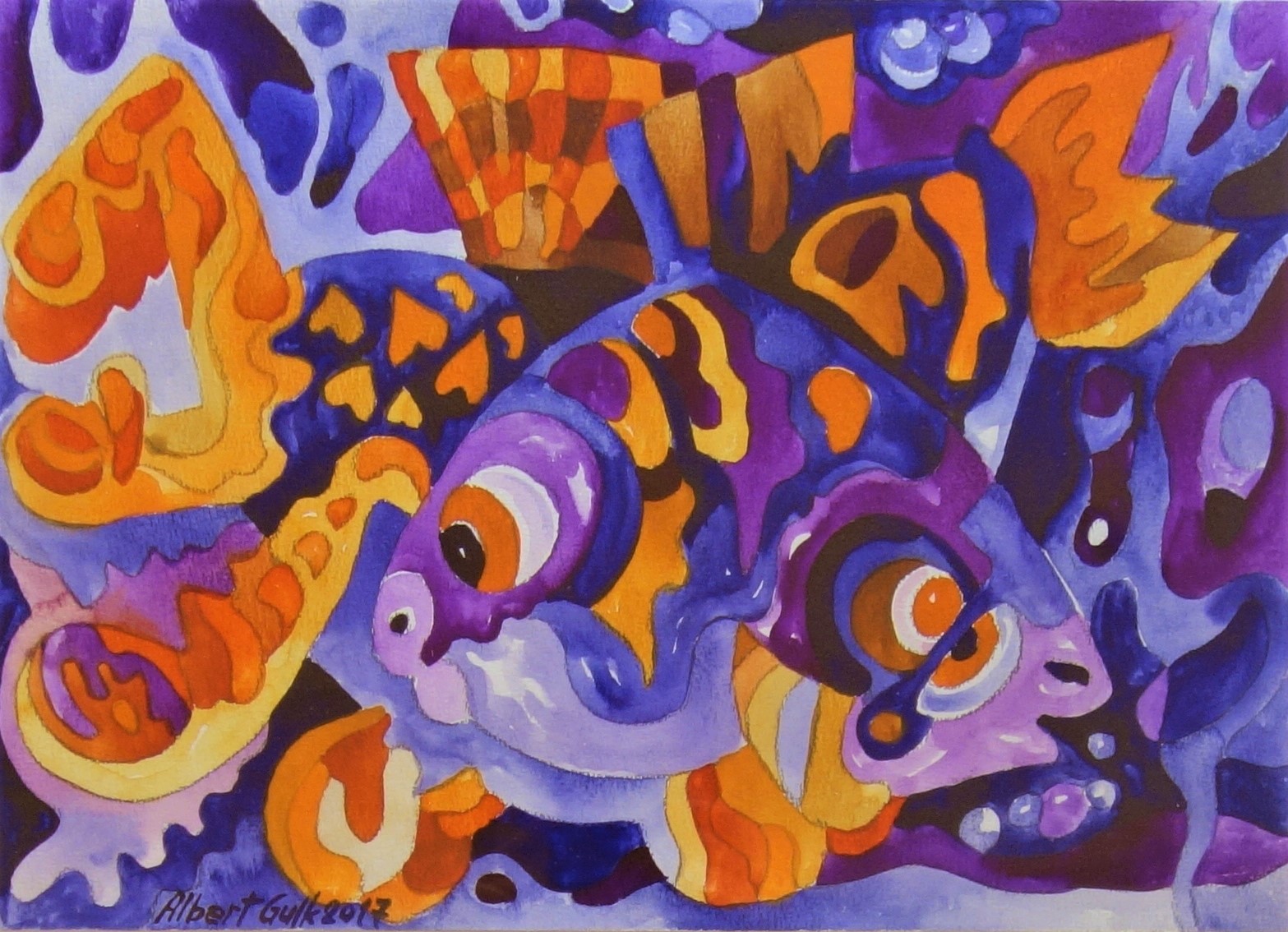 Albert Gulk (sünd 1969) Kuldkalad tintjas akvaariumis 2017 Akvarell, paber Lm 29,6x41,5 Hind: € 448 Müüdud Albert Gulk (sünd 1969) Kunstnik Albert Gulk sündis 1969