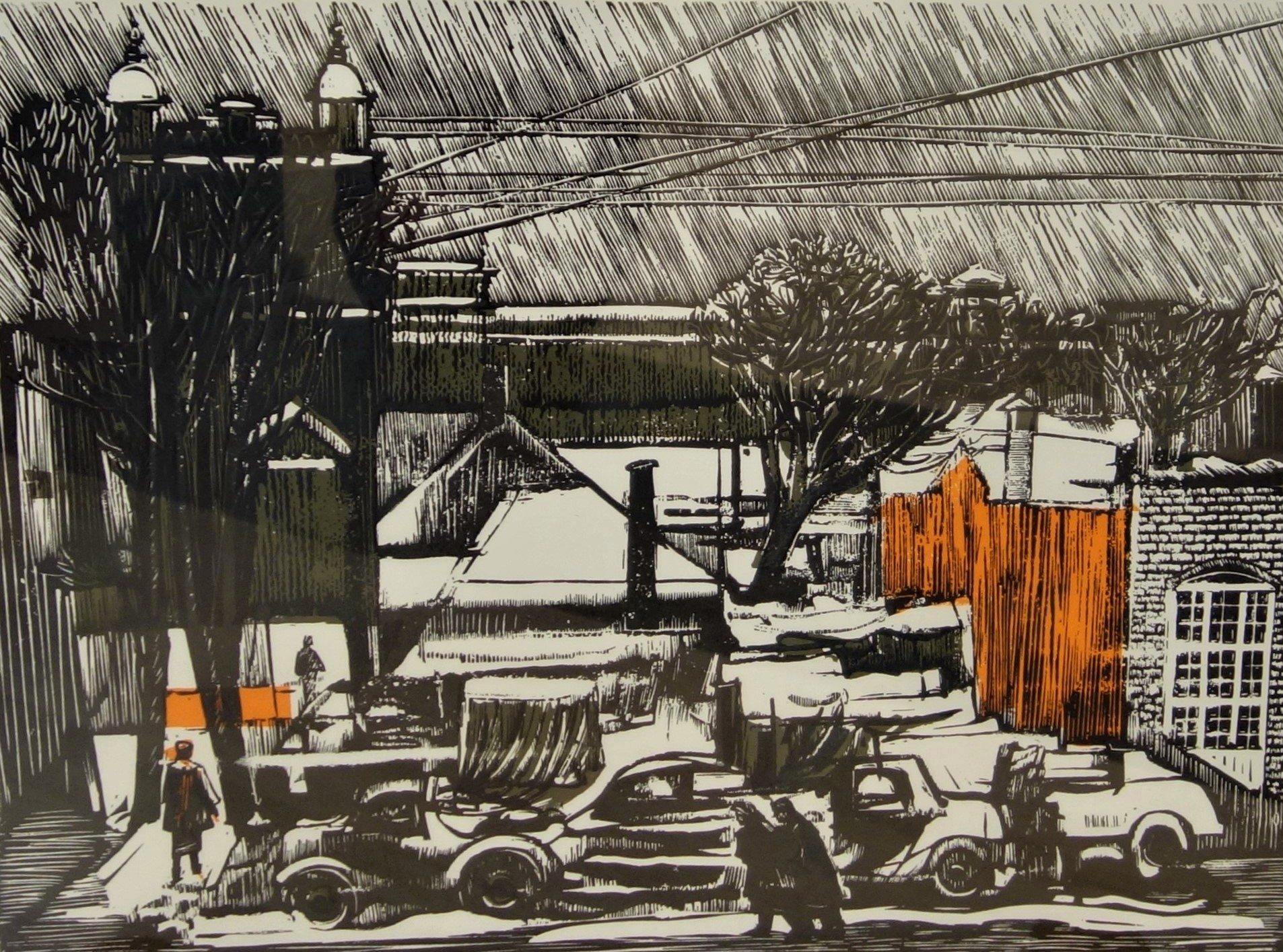 Erich Pehap (1912–1981) Linnavaade autodega 1955 Linoollõige, paber