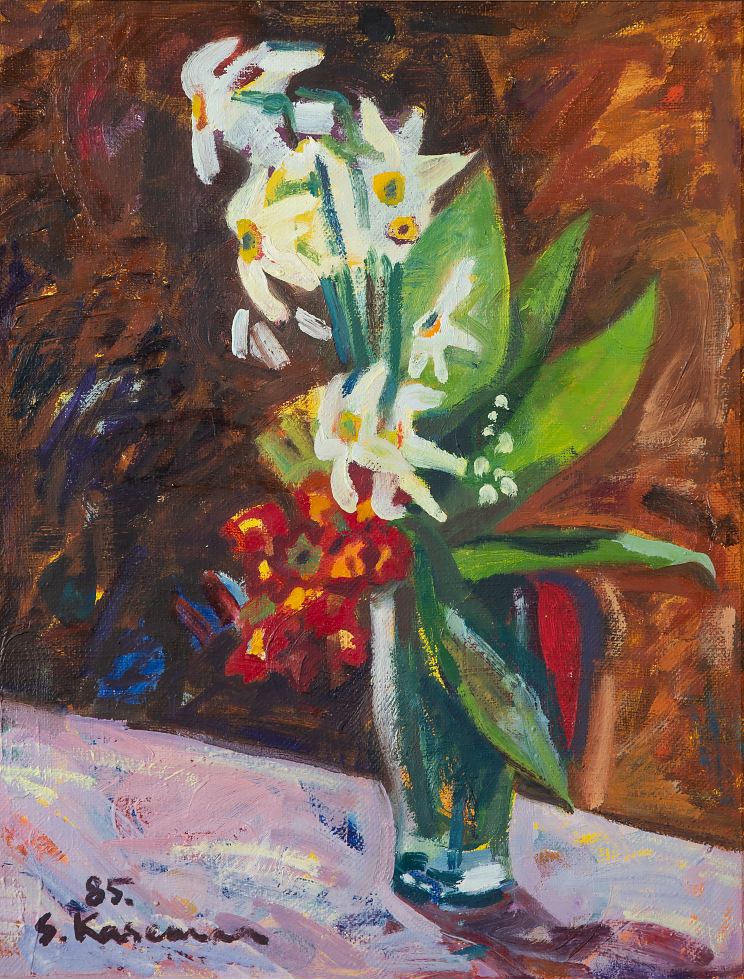 Saskia Kasemaa (1945-2019) Nartsissid 1985 Õli, lõuend Saskia Kasemaa omandas esimesed kunstialased teadmised oma vanematelt Elmar Kitselt ja Linda Kits-Mäelt. Õppis aastatel 1960–1965 Tartu Kunstikoolis ning seejärel ERKI maaliosakonnas, mille lõpetas 1971 Lepo Mikko juhendamisel. Kasemaa oli pühendunud kunstipedagoog ning töötas 1974–1985 Tartu Kunstikoolis ja 1988–1997 Tartu Ülikooli maaliosakonnas. Kunstiteadlane Mirjam Peil on 1985. aastal kirjutanud: „Saskia Kasemaa maalib omas perekondlikult traditsioonilises laadis ebaluseta, enesekindlalt ja meisterlikult. /.../tihedalt töötlev ja samal ajal etüüdlikult värske lähenemine ilmutab end veidi hollandipärastes natüürmortides.“