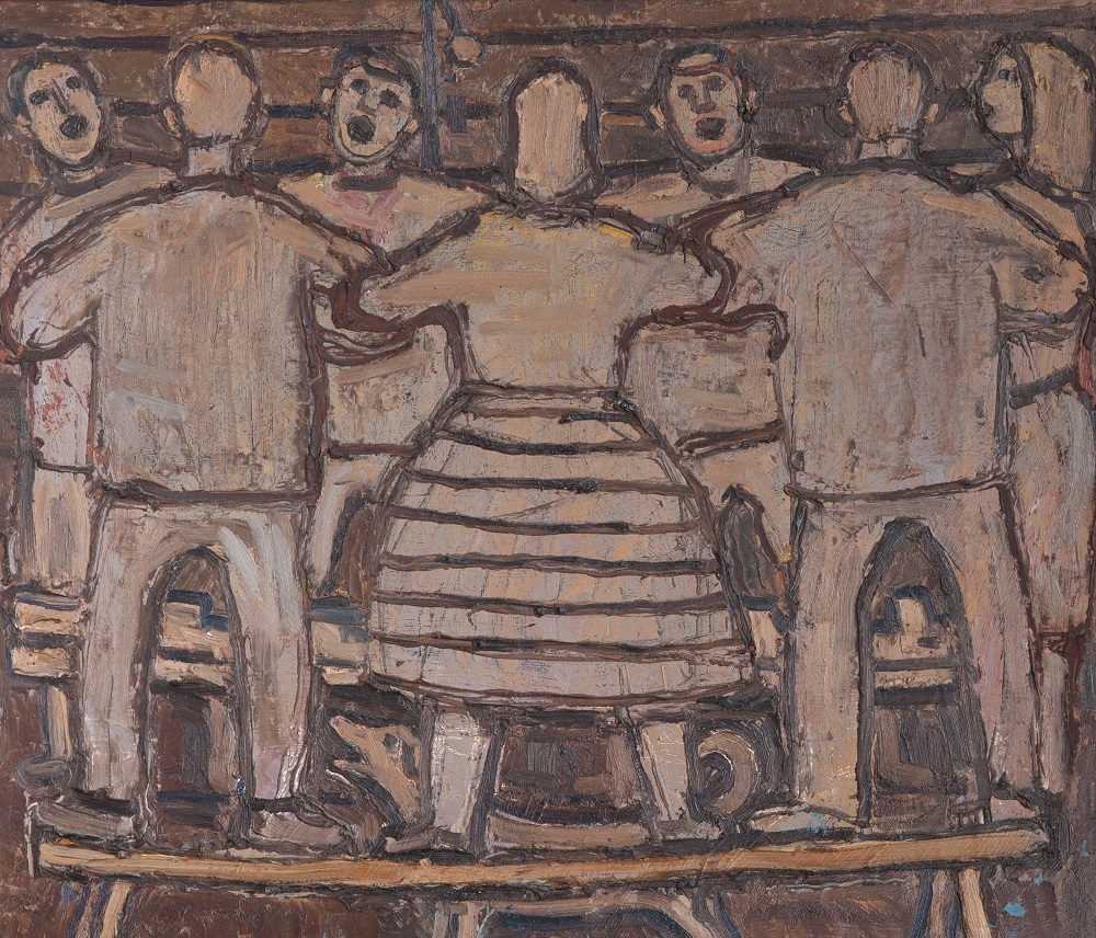 Aleksander Suumann (1927–2003) Õllelaul 1960ndate II pool Õli, lõuend Signatuur taga Luuletaja ja kirjandusteadlane Toomas Liiv on AleksanderSuumanni meenutades märkinud, et ta justkui hõljus omamaailmas. Tegu oli tõelise boheemlase ja loojaga, kes leidis võimaluseeneseväljenduseks nii kunstis kui luules. AleksanderSuumann alustas kunstiõpinguid 1947. aastal Tartu RiiklikusKunstiinstituudis ning lõpetas 1954. aastal maali erialal.Seejärel tegutses vaheldumisi vabakutselisena ning kunstipedagoogina.1960. aastate alguses tekitasid poleemikat tema primitivistlikudteosed, mille kaudu püüdis Suumann vabaneda õpinguteajal peale surutud realismist. Käsitluslaad on neis tundlikja luuleline, väljendusvahendid aga lihtsad.