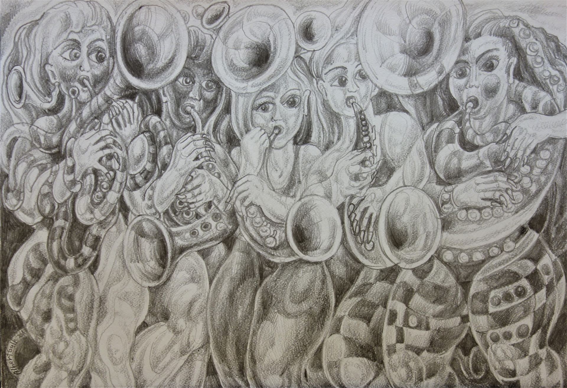 Pasunatüdrukud, Albert Gulk E-kunstisalongis Albert Gulki algupärast taidurlikkust toonitab fakt, et kunstnik ei kasuta oma joonistustes modelli ega foto abi ja toetub üksnes oma visuaalse mälu kujunditele Pasunatüdrukud, Albert Gulk E-kunstisalongis Gulk Albert