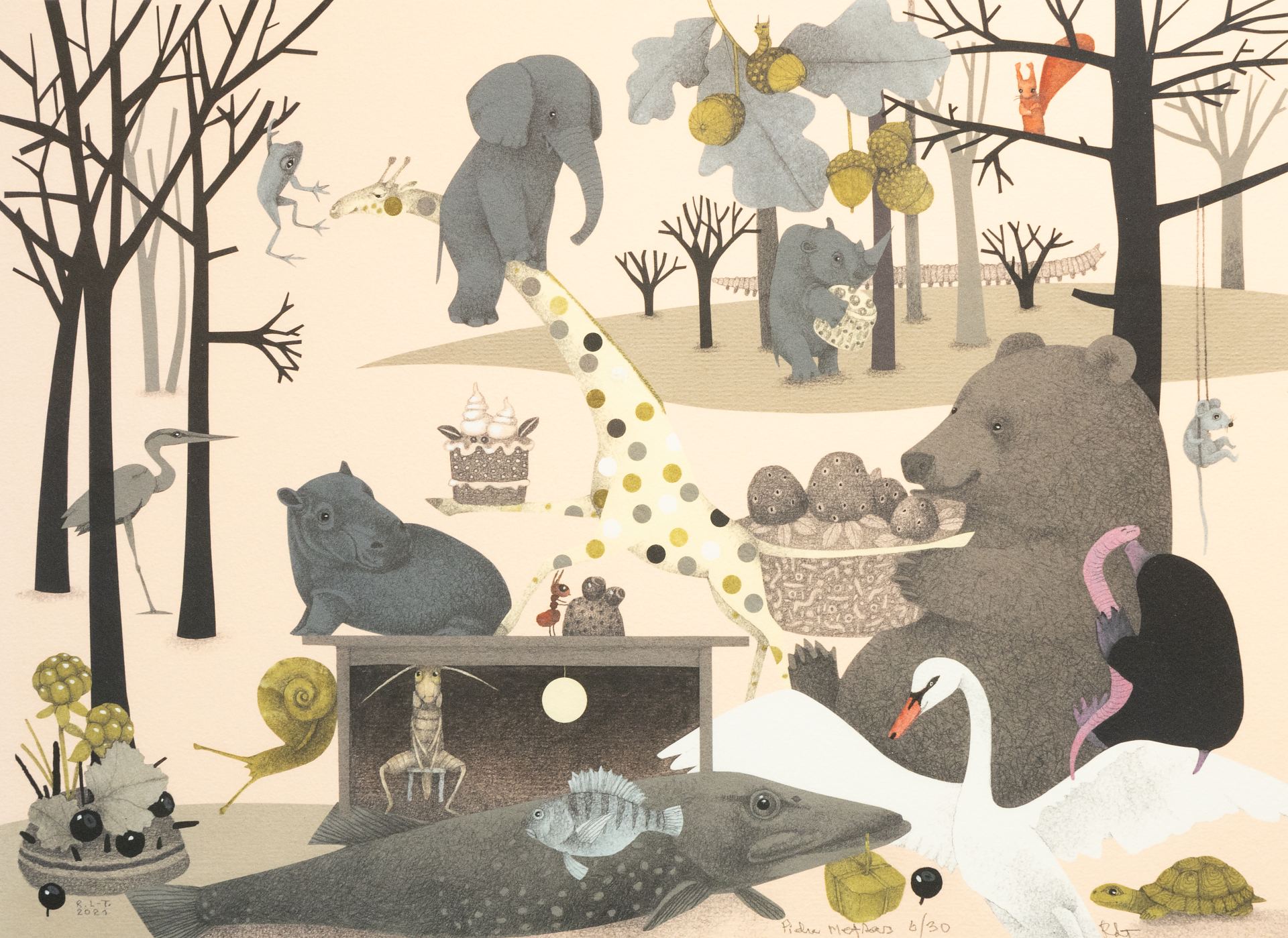 Regina Lukk-Toompere (sünd 1953) Pidu metsas (illustratsioon raamatust 'Kuidas kilk terveks sai') 2021 Giclée, paber
