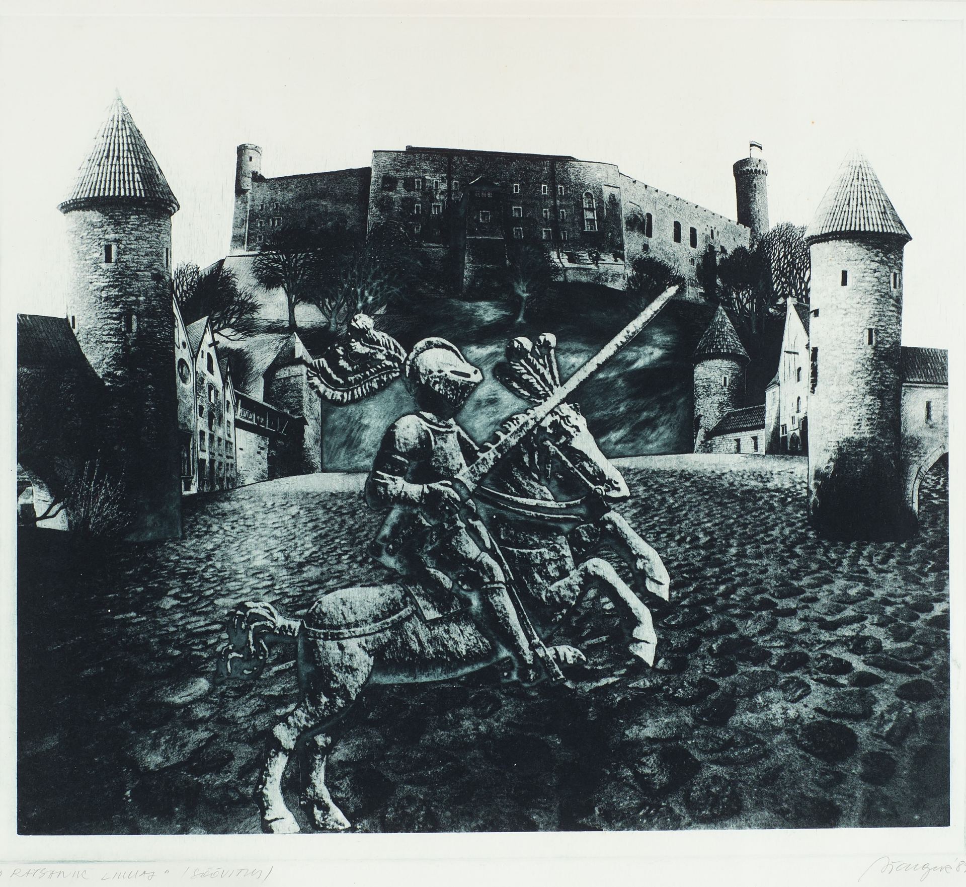 Vladimir Taiger Ratsanik linnas 1989 Söövitus, paber Vladimir Taiger alustas 1972. aastal kunstiõpinguid ning lõpetas ERKI 1978. aastal graafika erialal. Pärast lõpetamist pühendus pedagoogilisele tööle. Graafiline leht „Ratsanik linnas“ oli eksponeeritud 1989. aastal toimunud Tallinna VIII graafikatriennaalil ning on ära toodud näituse nimestikus. Kunstiteadlane Mai Levin on kirjutanud: „Taigerile on omane hüperrealismi-segune laad, kohati üllatab autor lüüriliste elementidega. Teostel köidavad abstraktsed ja vaid tükati de¹ifreeritavad olukorrad, mis loovad kordumatu õhkkonna.“ Taiger pälvis 1990. aastal korraldatud Eesti krooni kavandite võistlusel I auhinna ning kujundas taasiseseisvunud Eesti paberraha.