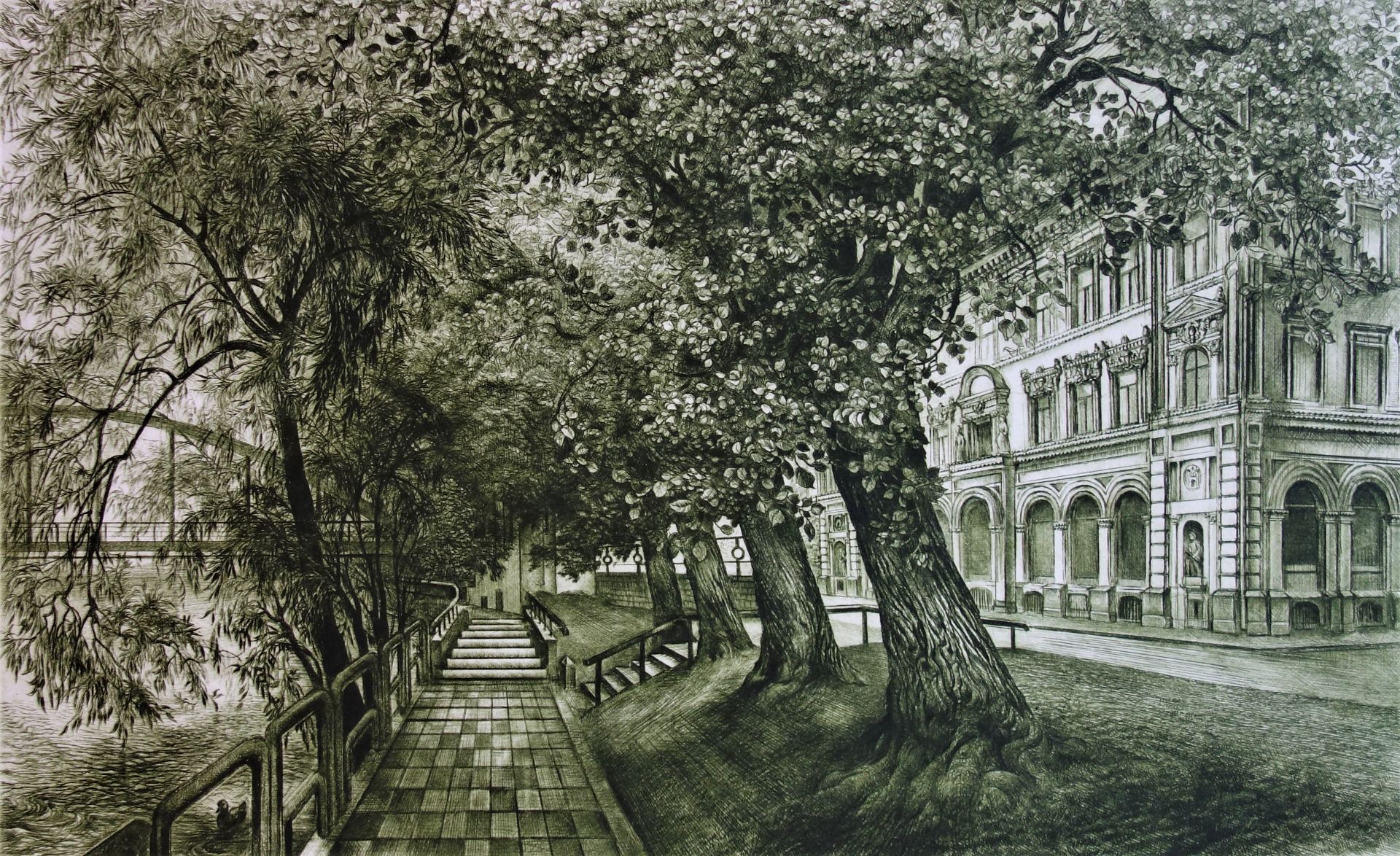 Tartu Emajõe kallas, Viive Graafiliste tehnikate (ofort, kuivnõel) kõrval on kunstnik viljelenud ka pastell-, akvarell- ja õlimaalitehnikat Tartu Emajõe kallas, Viive Kuks E-kunstisalongis Kuks Viive