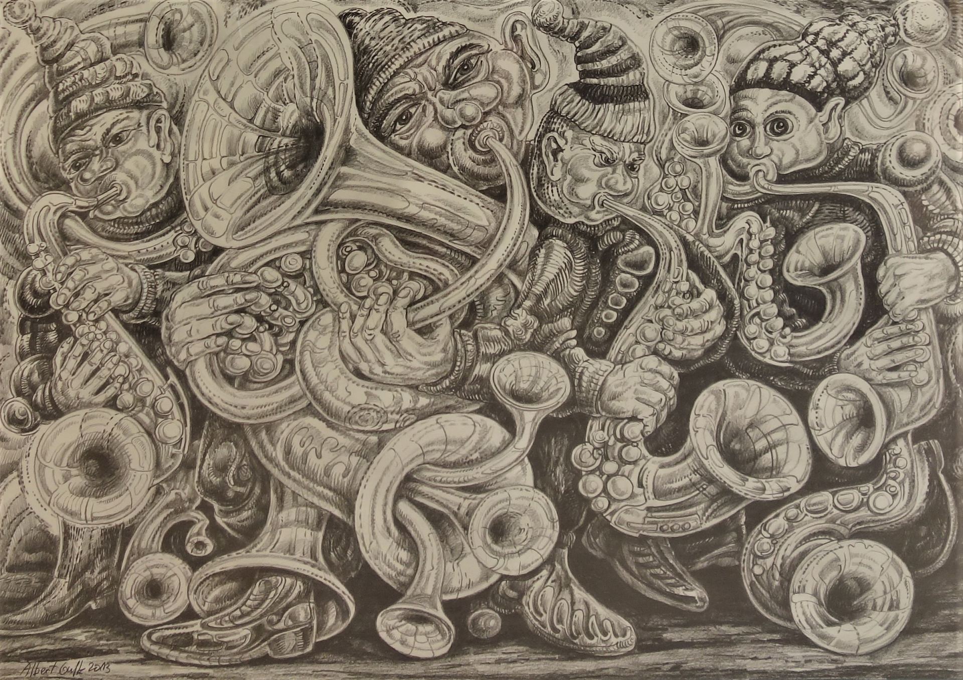 Uued pasunad, Albert Gulk Albert Gulki algupärast taidurlikkust toonitab fakt, et kunstnik ei kasuta oma joonistustes modelli ega foto abi ja toetub üksnes oma visuaalse mälu kujunditele Uued pasunad, Albert Gulk E-kunstisalongis Gulk Albert