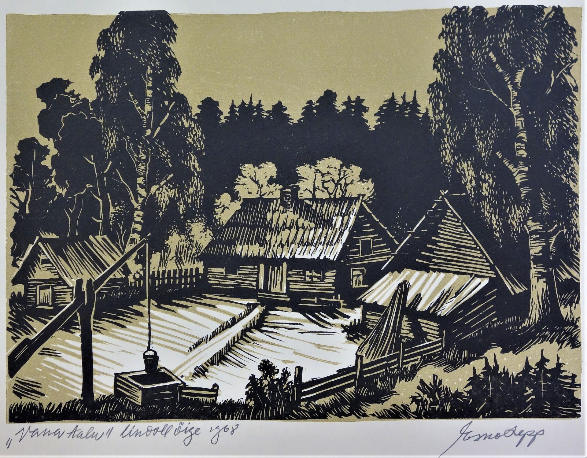 Esko Lepp (1906-1977) Vana talu 1968 Linool, paber